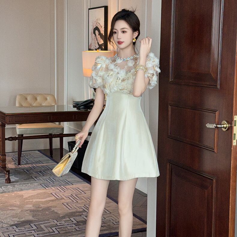 ウエストを引き締めるラインと、ふんわり広がるプリンセスシルエットが女性らしさを引き立て、歩くたびに優雅な存在感を放ちます。