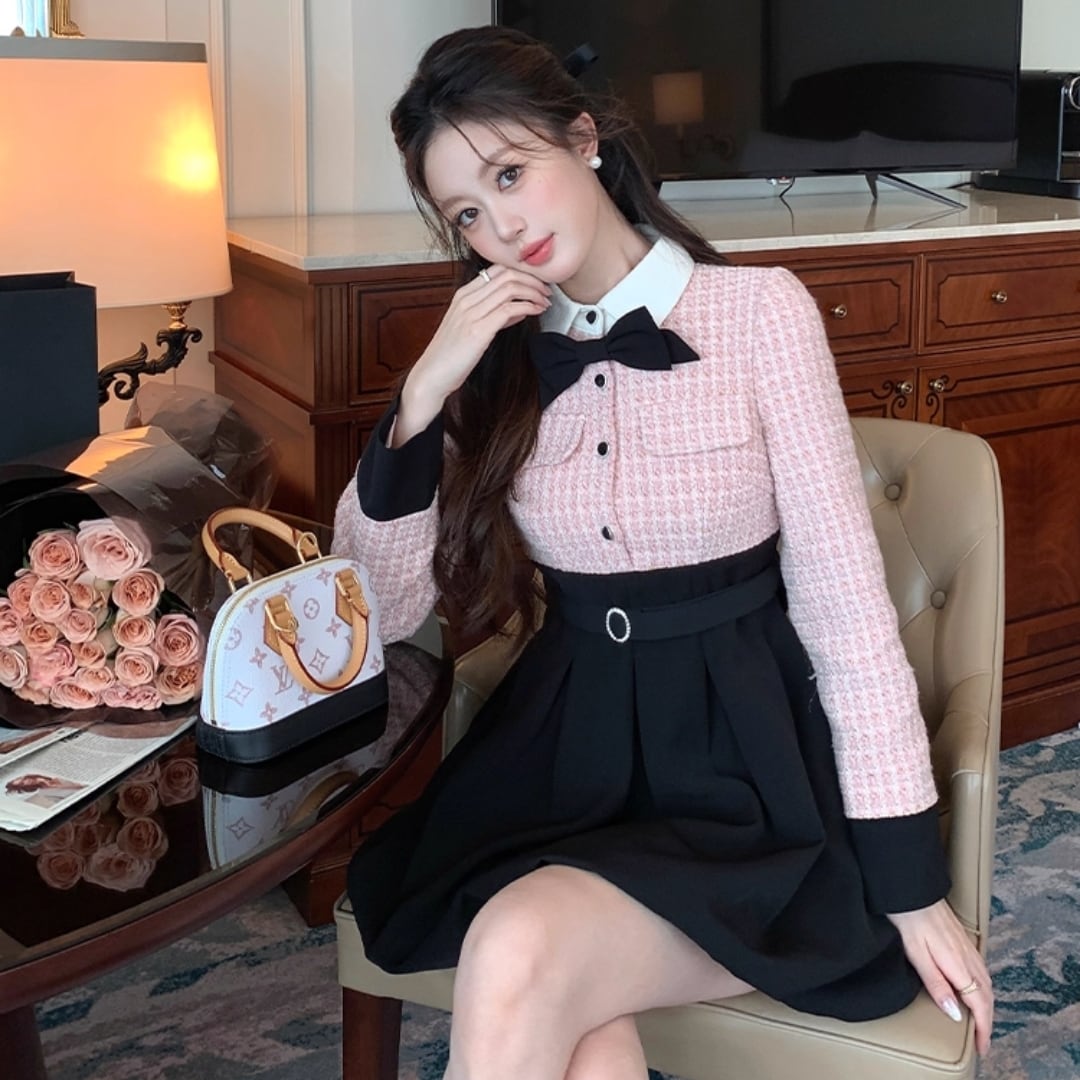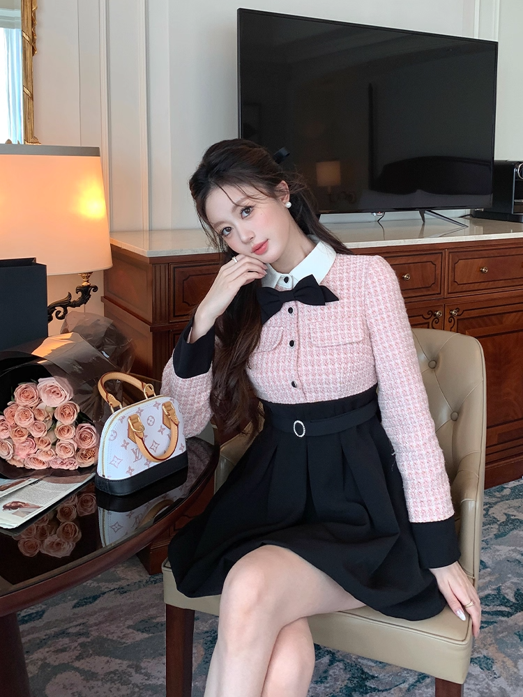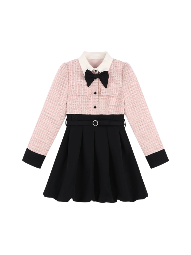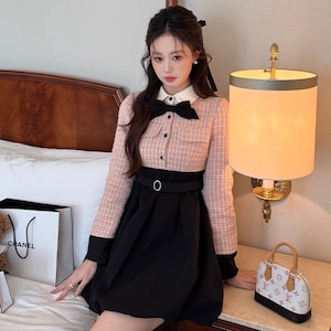 淡い桜色のツイードが、可憐で上品な物語を紡ぐワンピース。