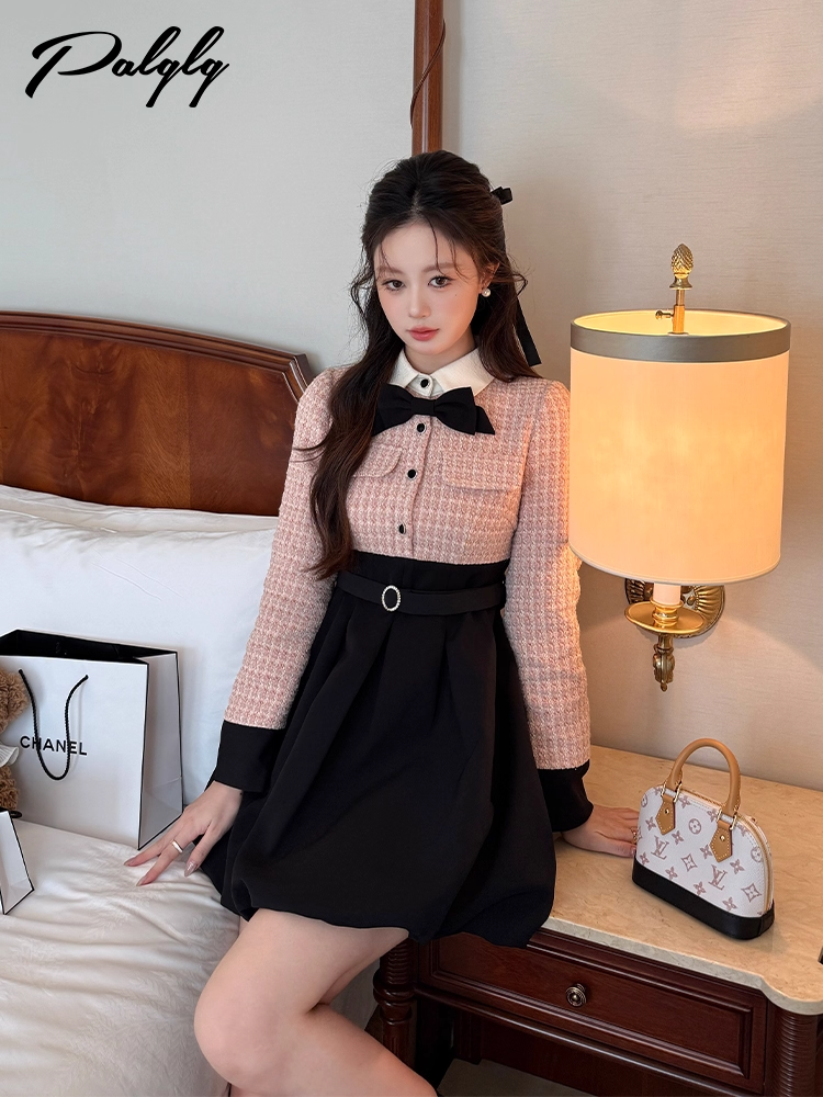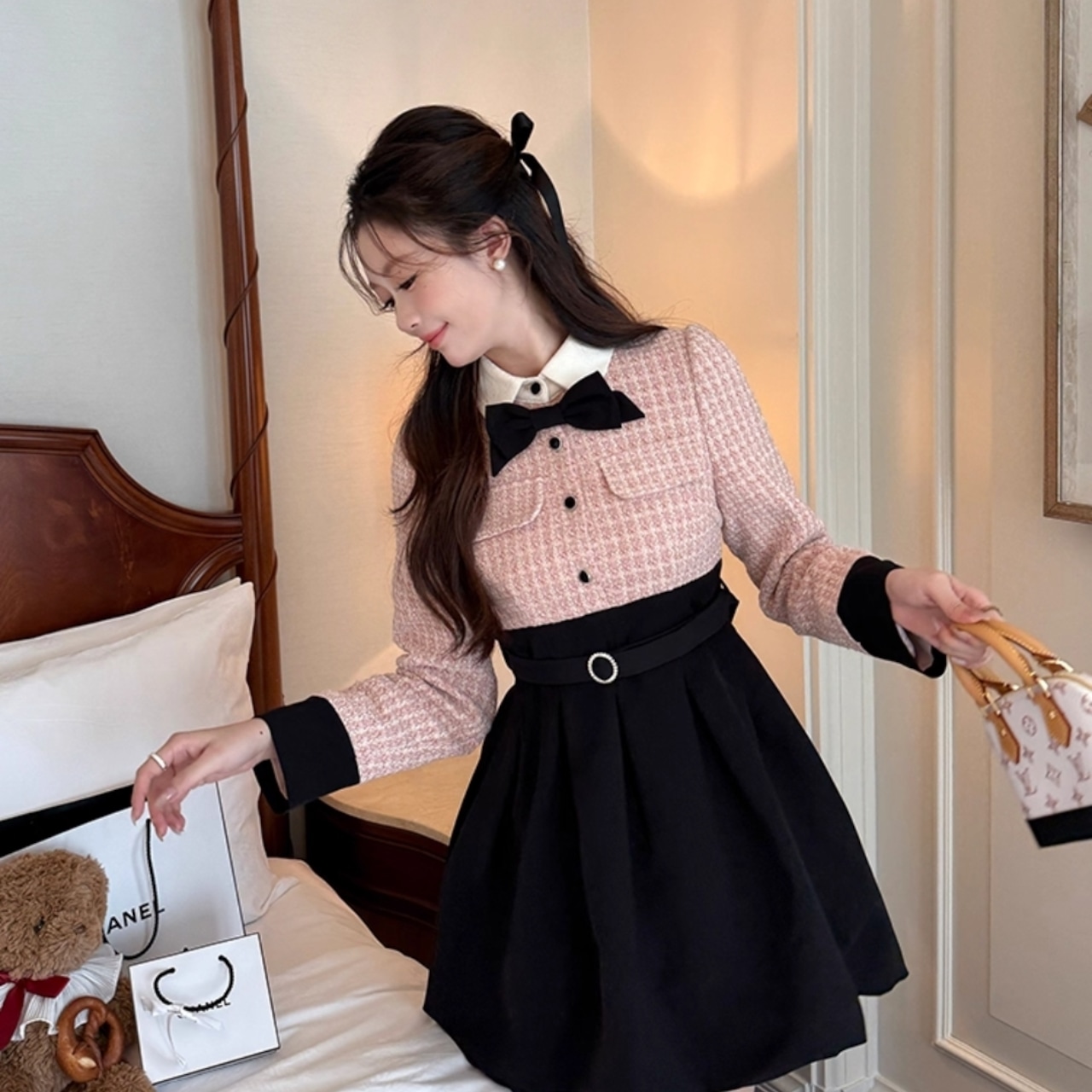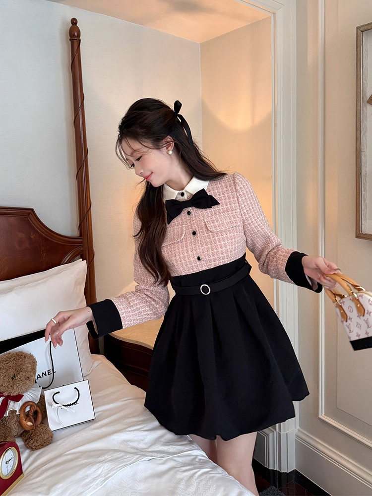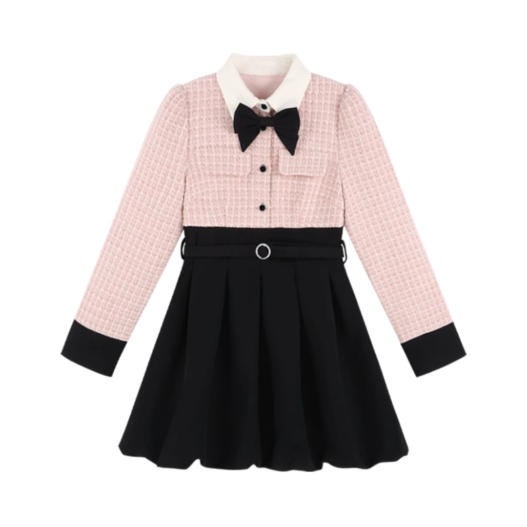 淡い桜色のツイードが、可憐で上品な物語を紡ぐワンピース。