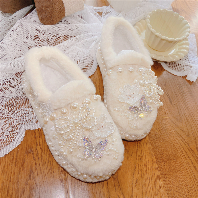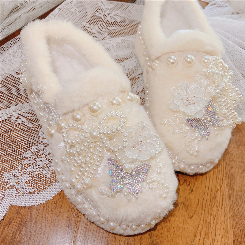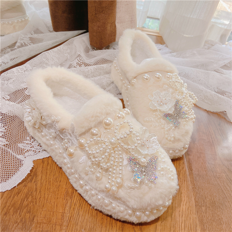 外でも室内でも、雪のようにやわらかな光をまとう一足。