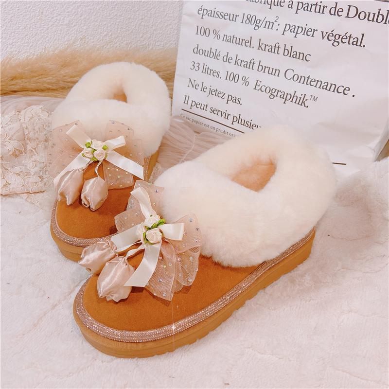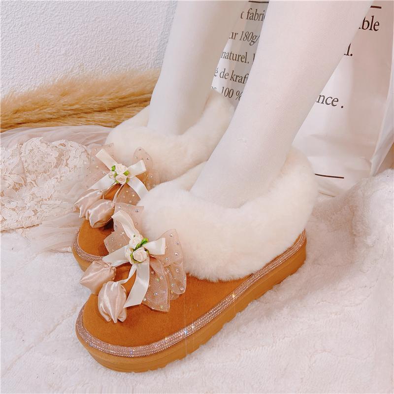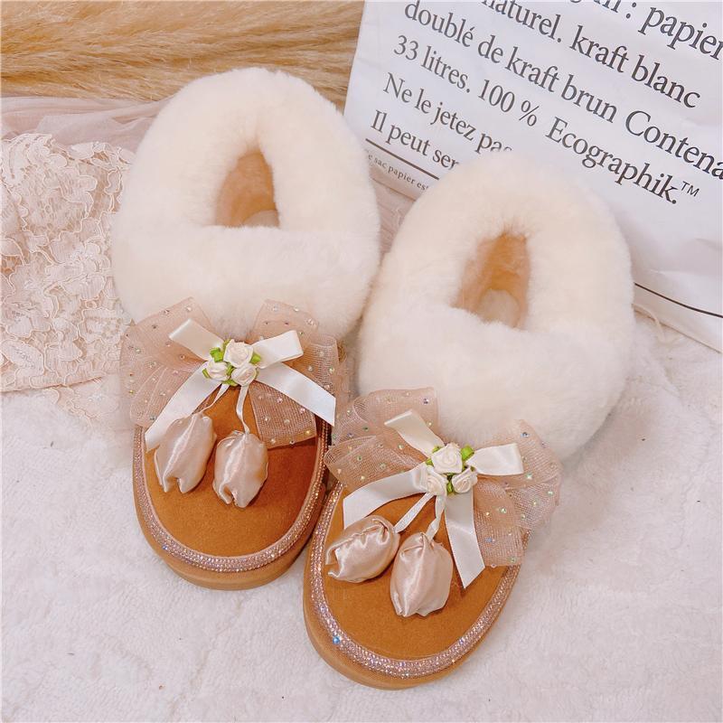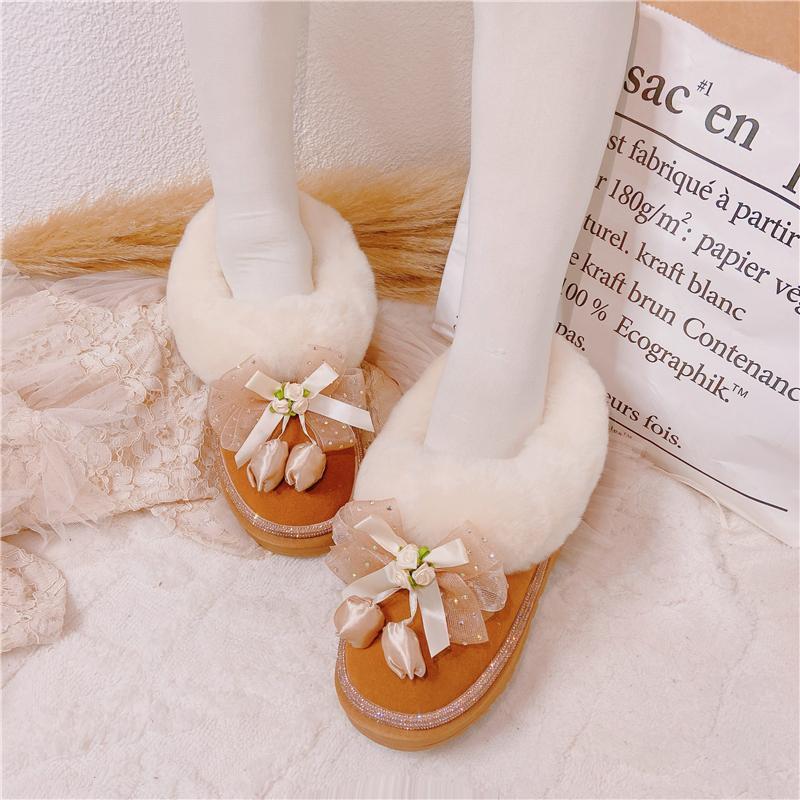 足元にそっと寄り添うのは、ふんわりとしたファーと優しいリボン。