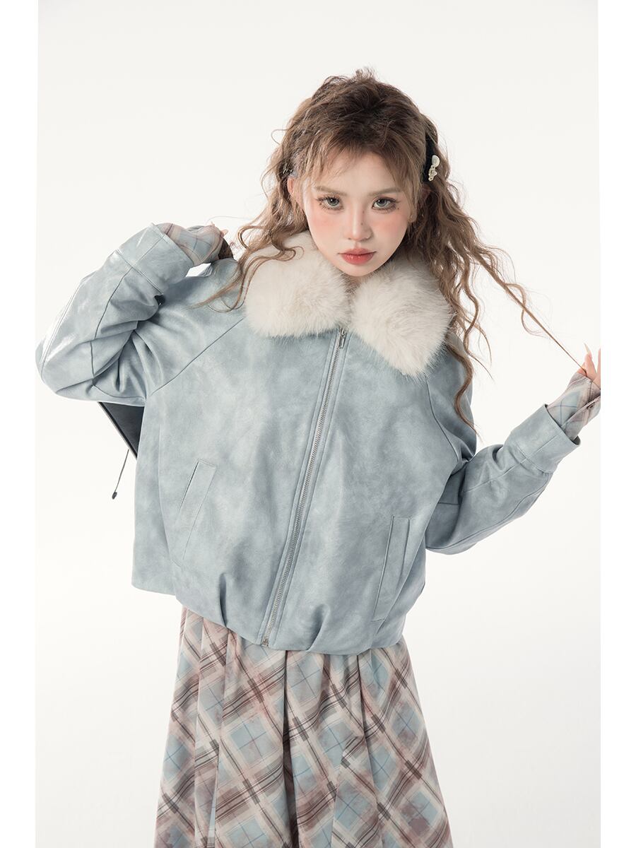 スモークブルー – 取り外しファーカラー レザージャケット ♥A030