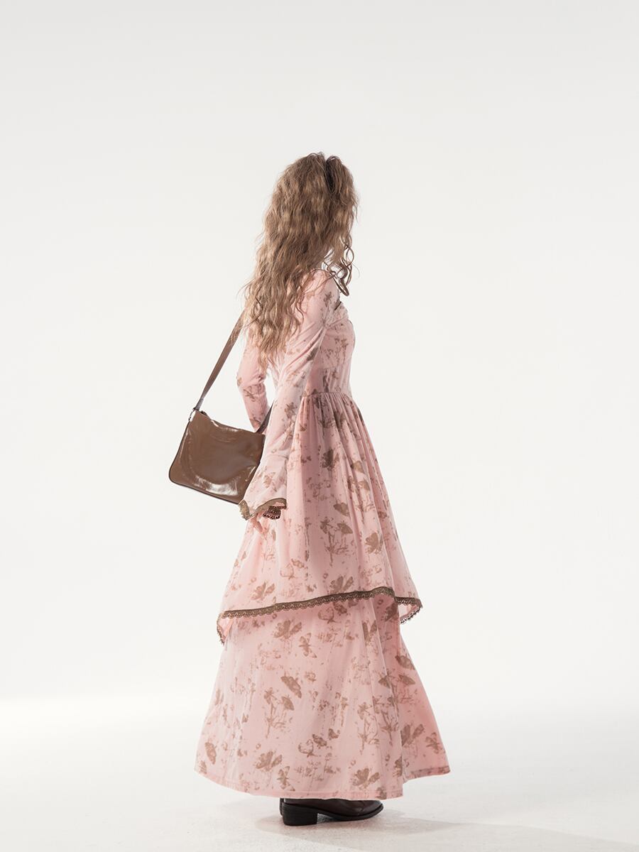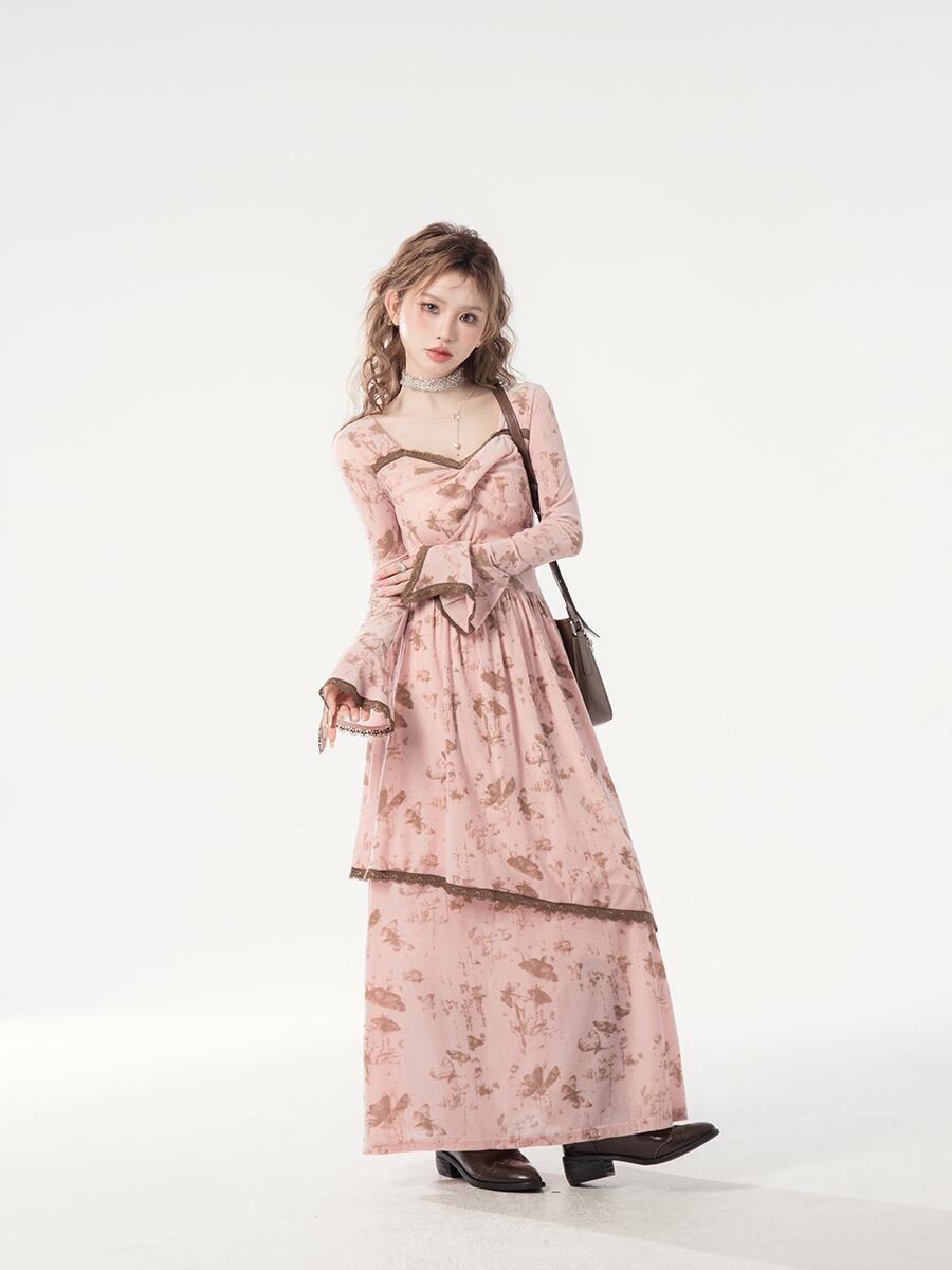 カフェローズ – ロングスリーブプリントドレス ♥A048