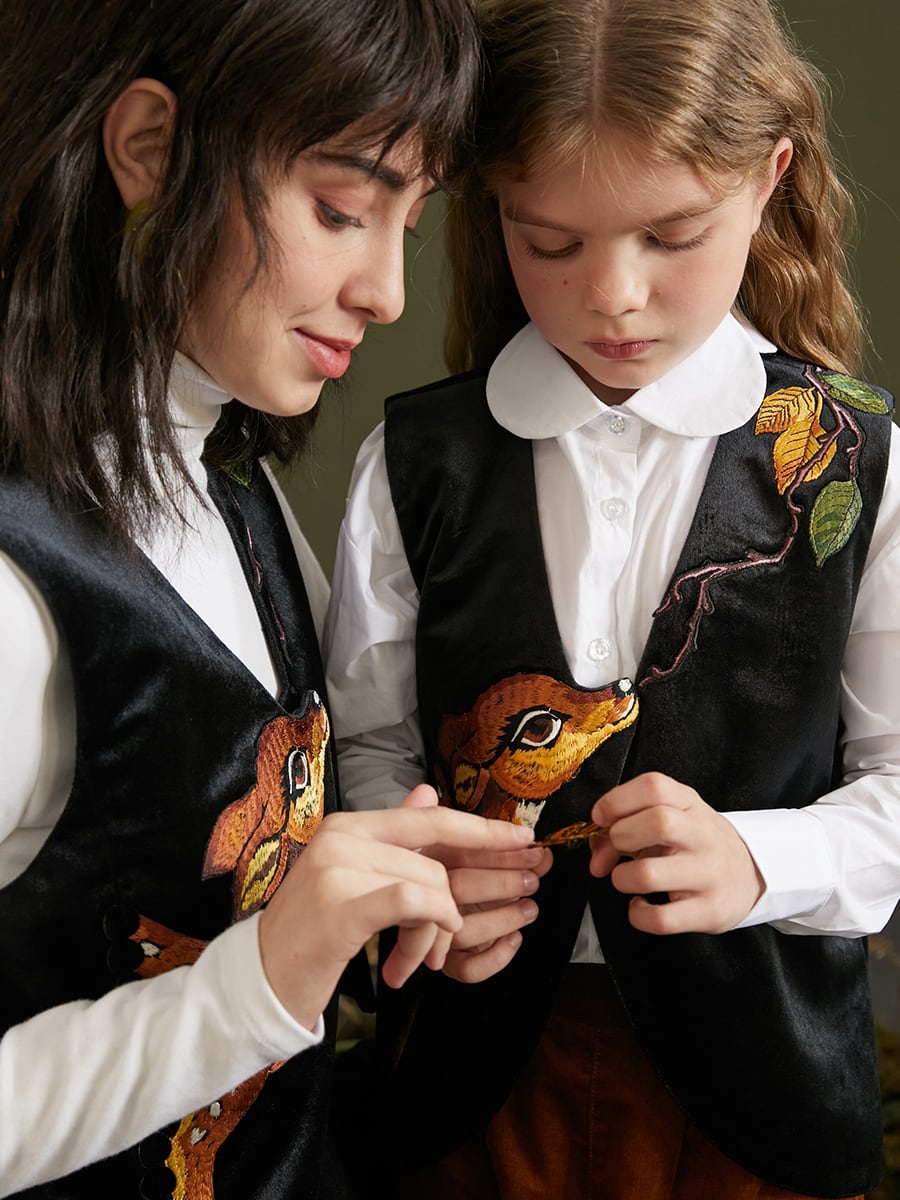 胸元の鹿の刺繍が、ノスタルジックな気品を添える。