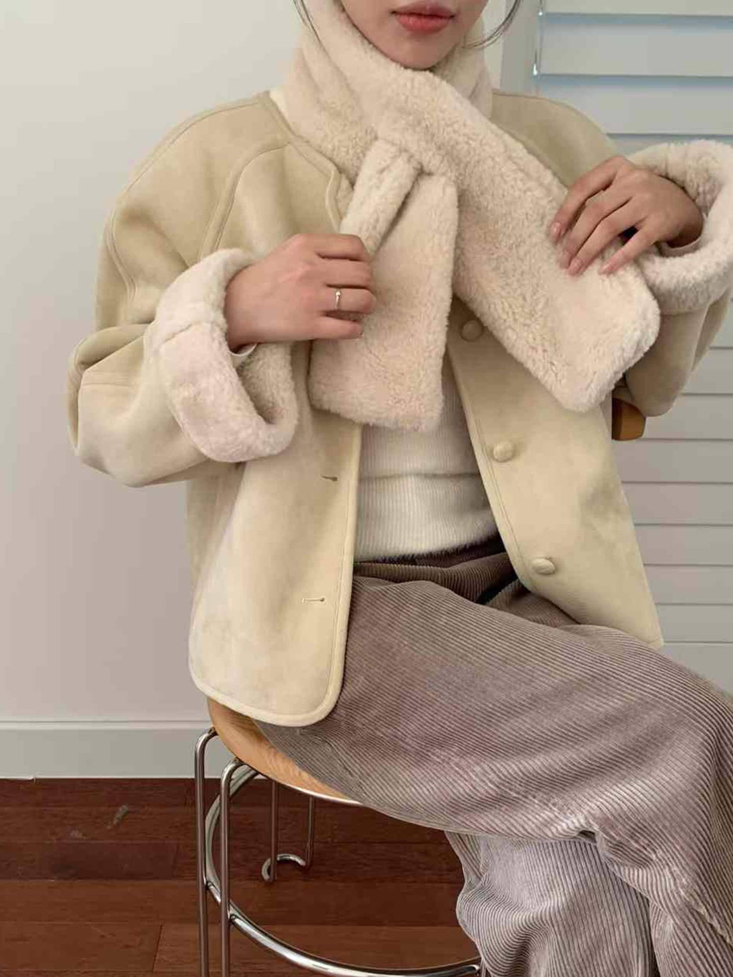 ふわりと首元を飾るスカーフ付きで、上品さと温もりを両立。