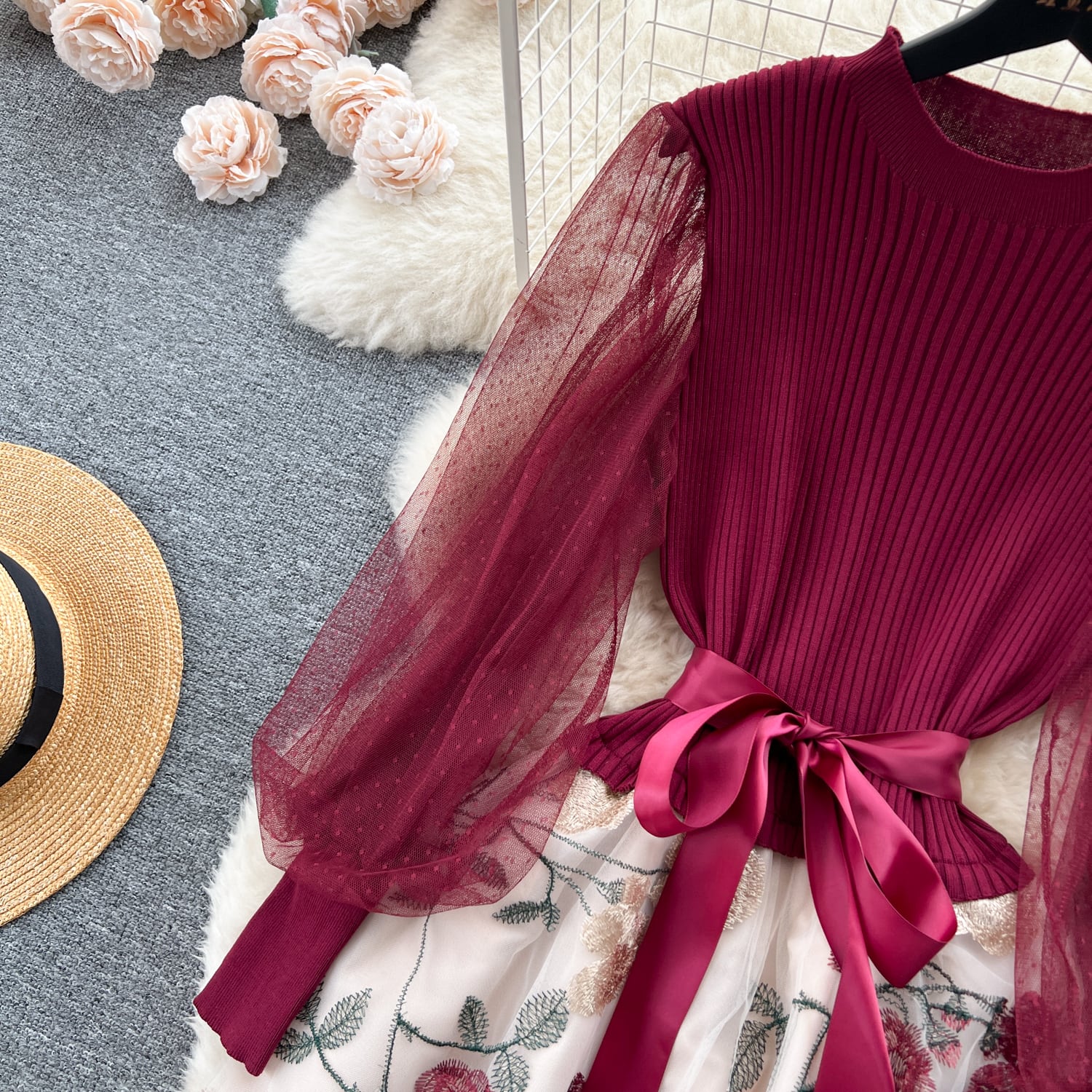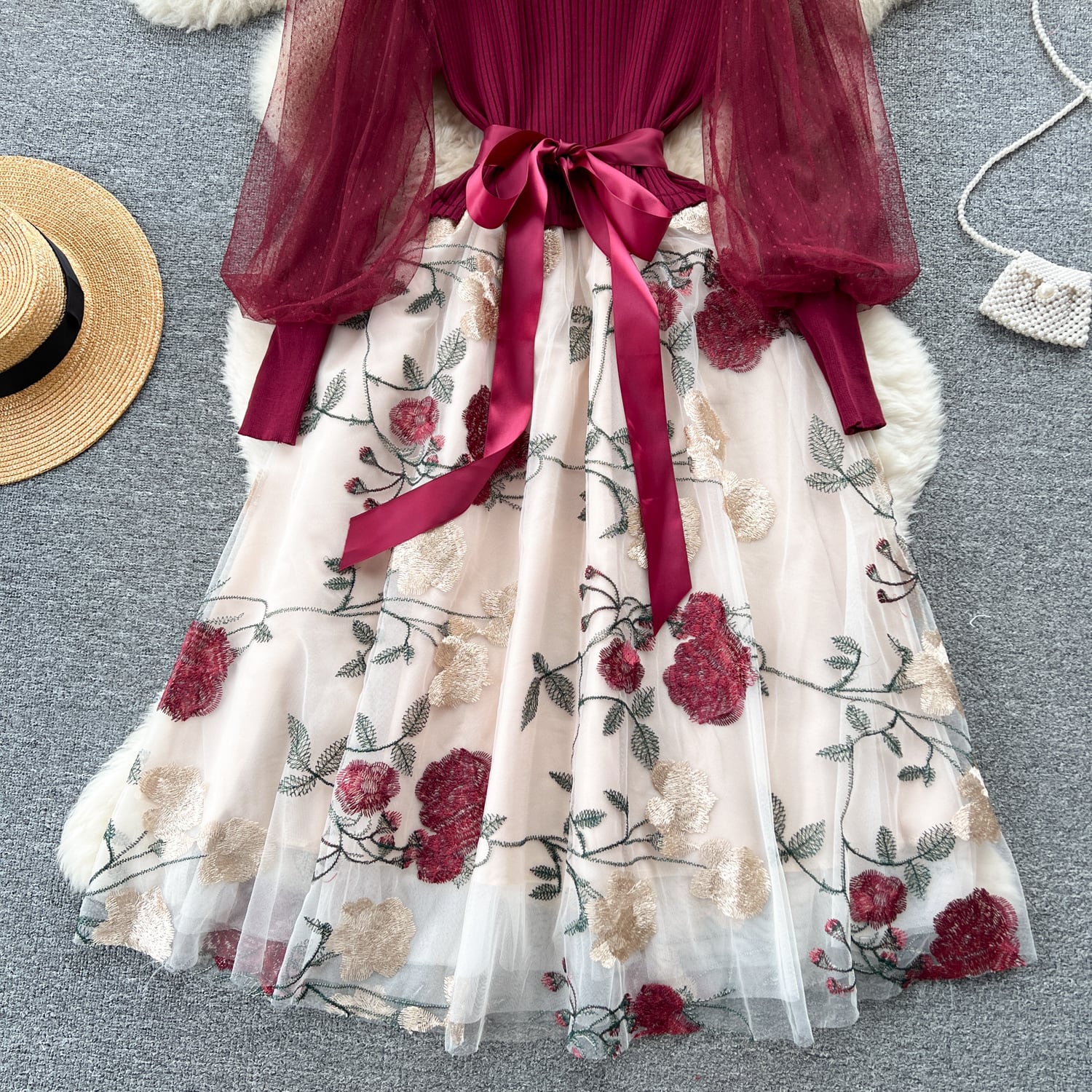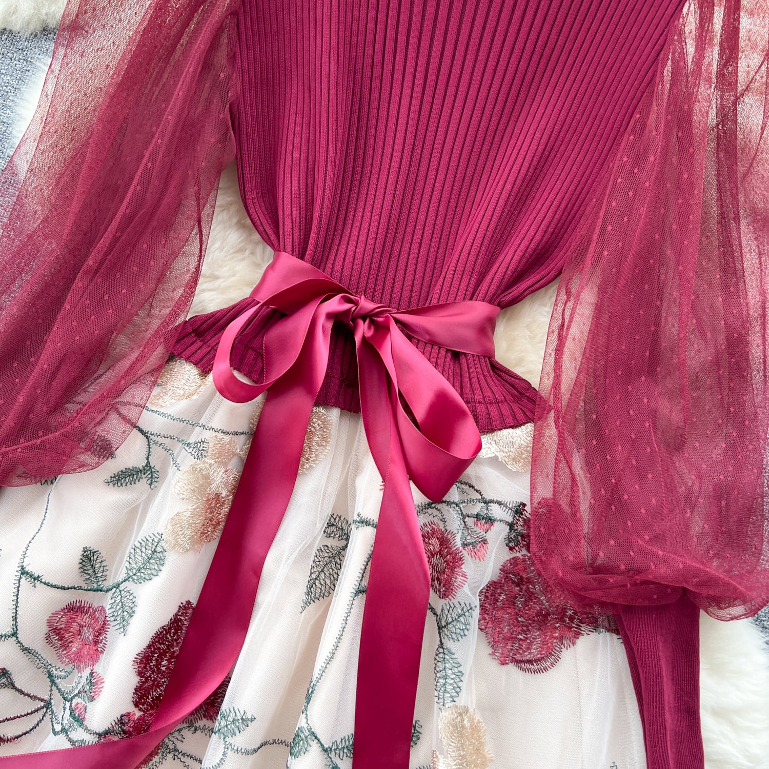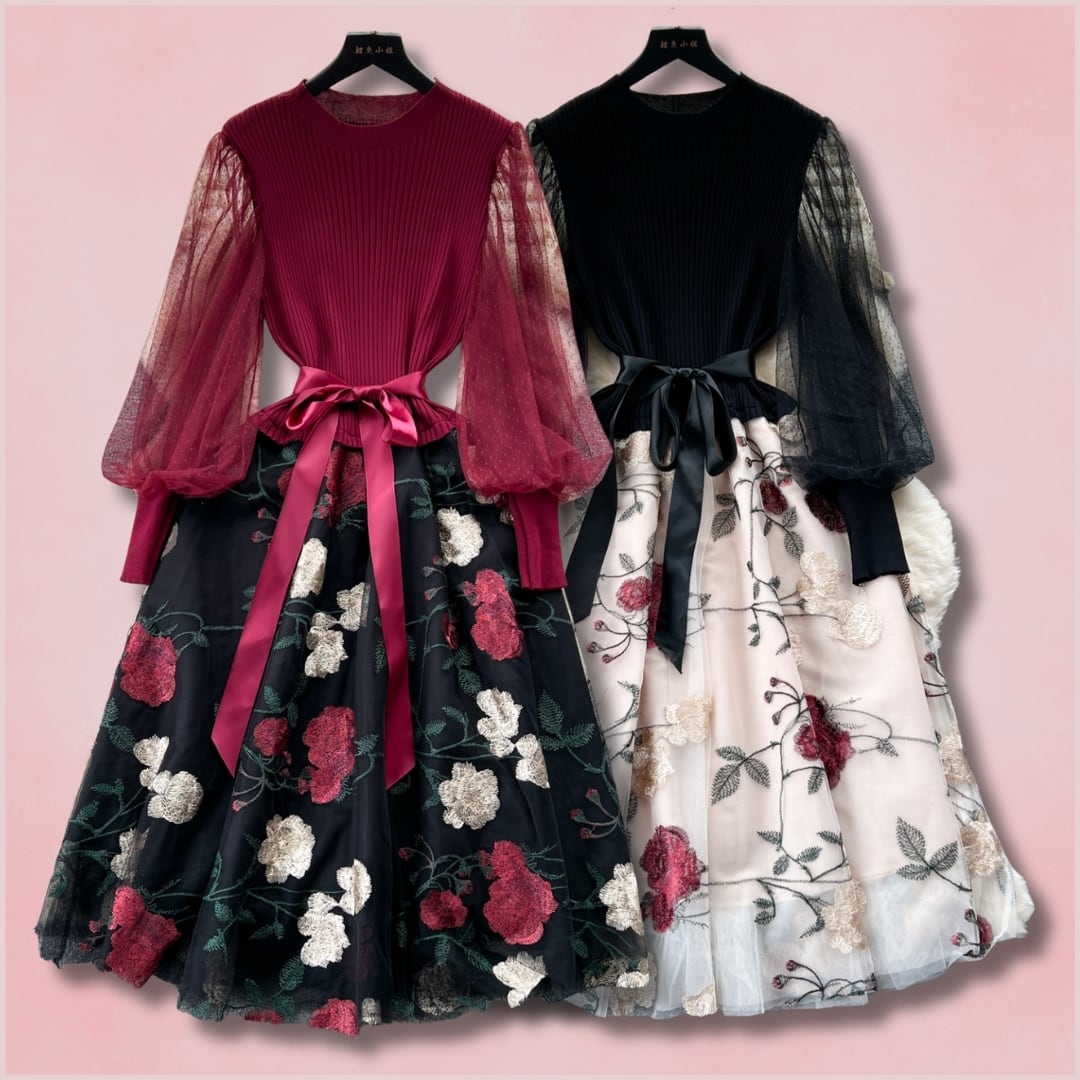 繊細なチュールと刺繍が織りなす、ロマンティックなニットドレス。