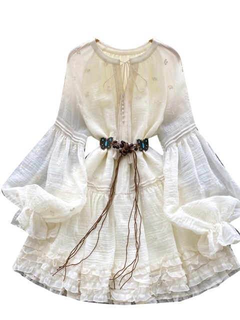 ふんわりと広がるパフスリーブと、ウエストを優しく結ぶリボンデザインが