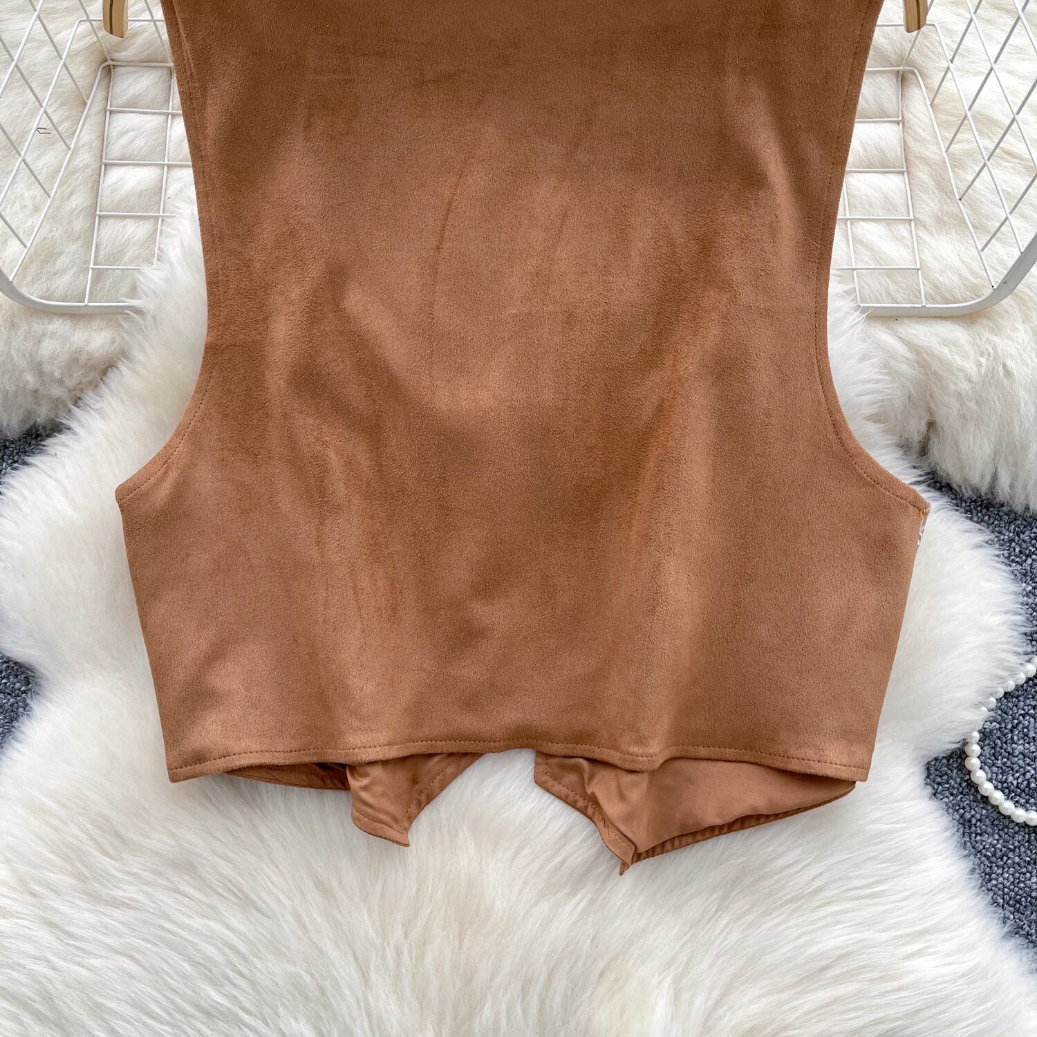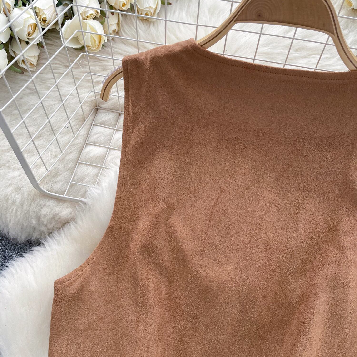 ノースリーブ仕様で、ブラウスやワンピースとのレイヤードも楽しめる一枚です。