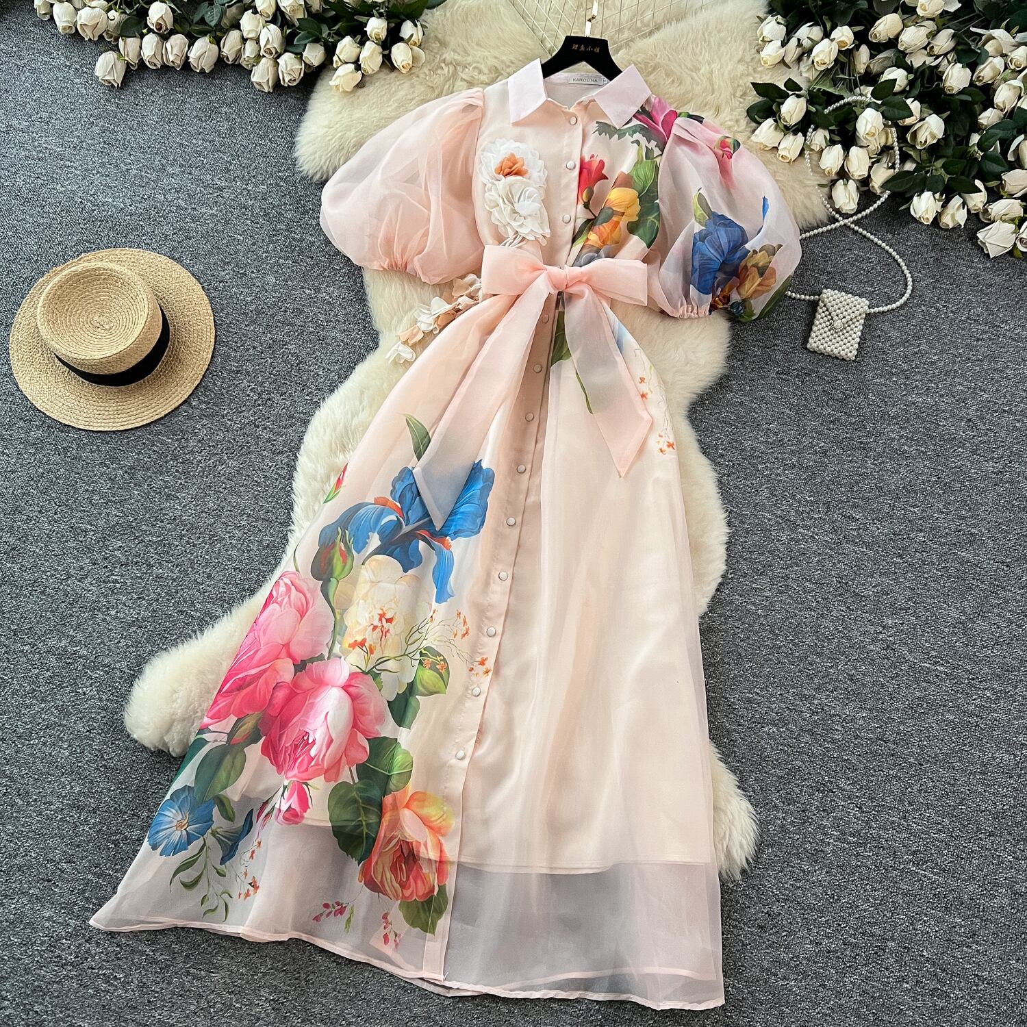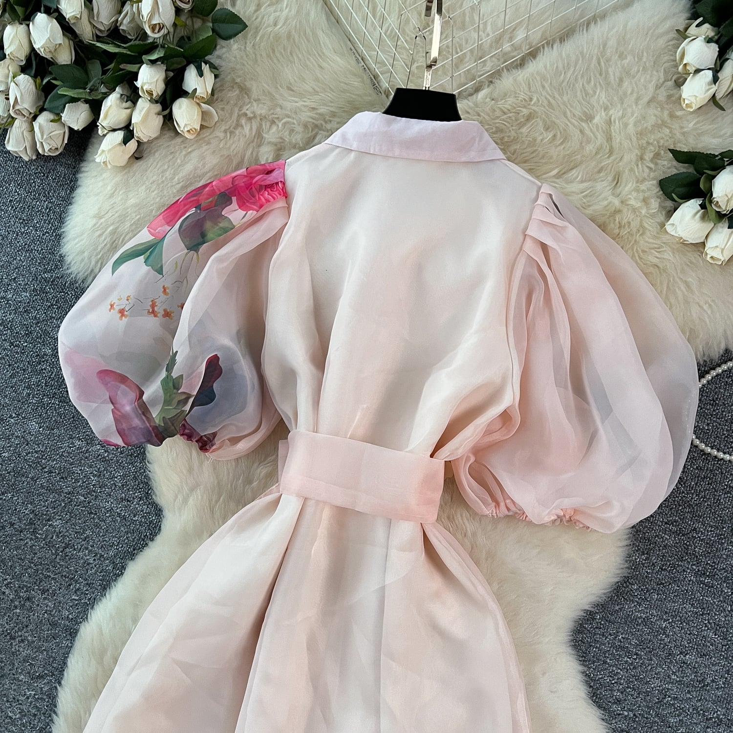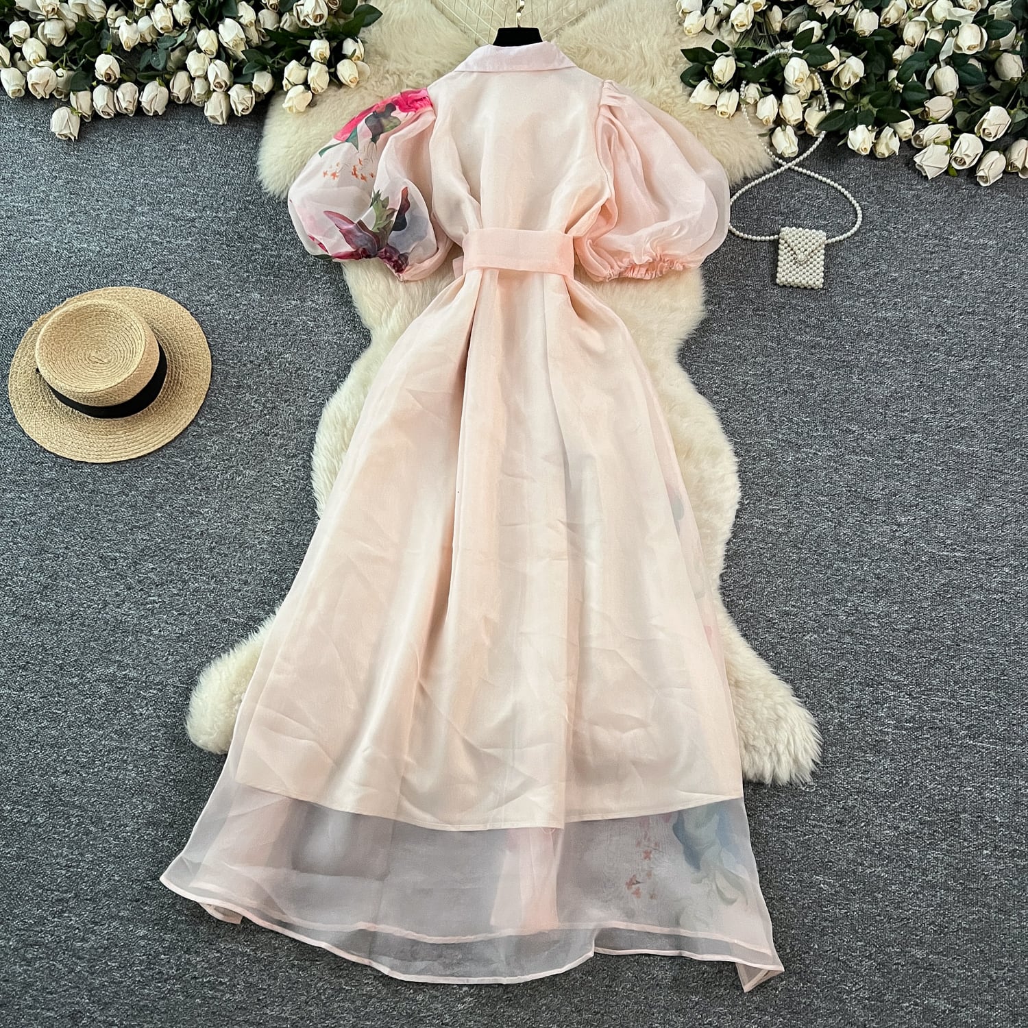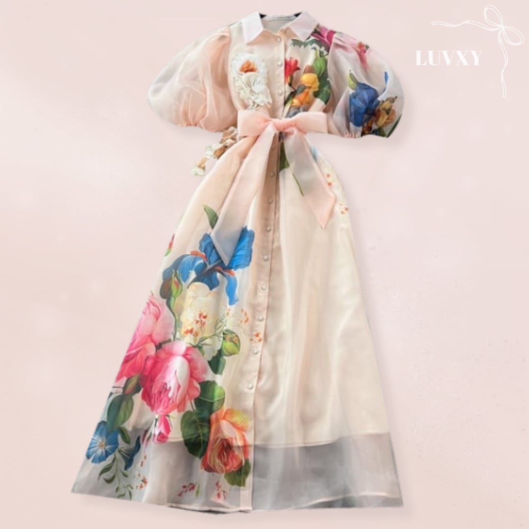 繊細なフラワープリントと透け感のある素材が軽やかに揺れ、