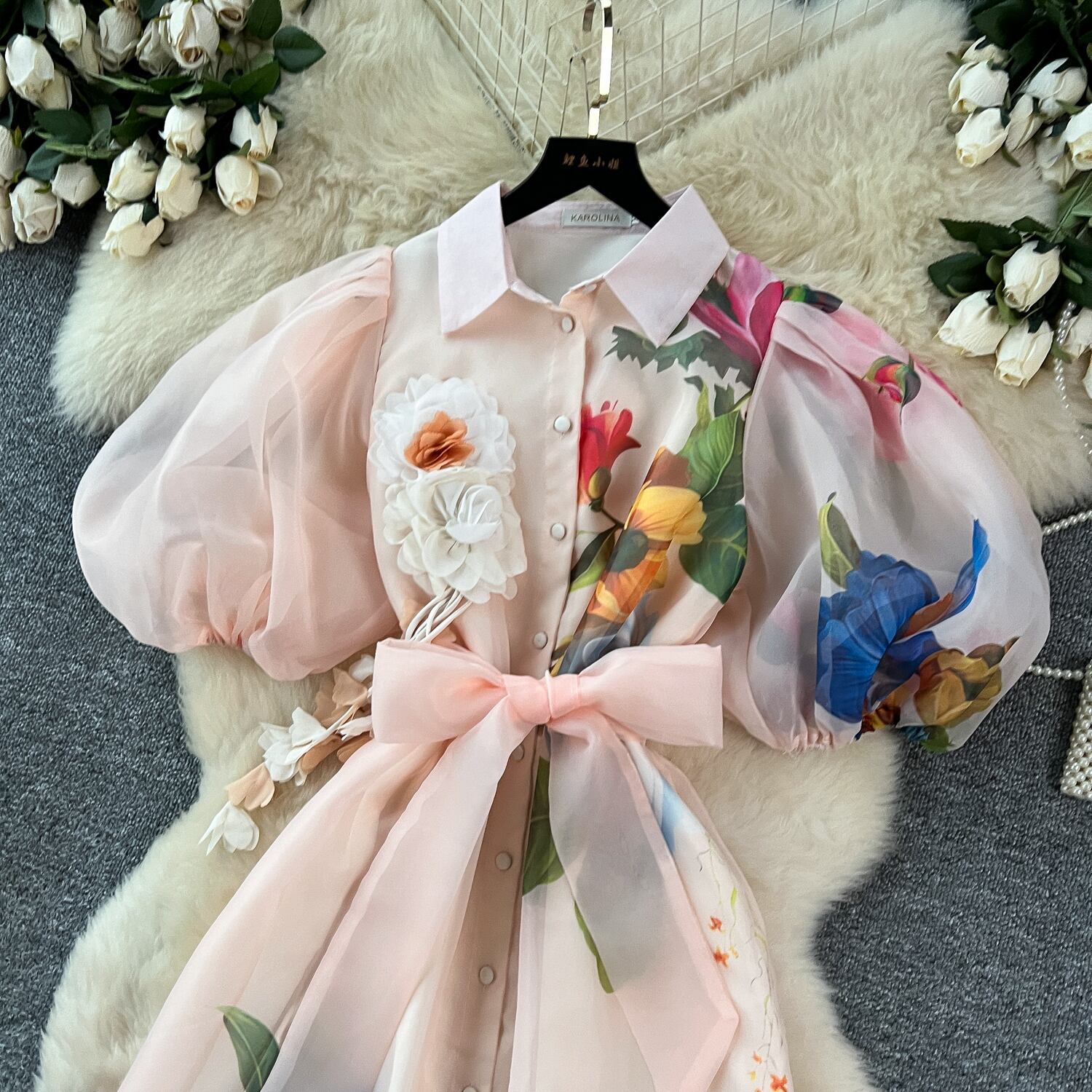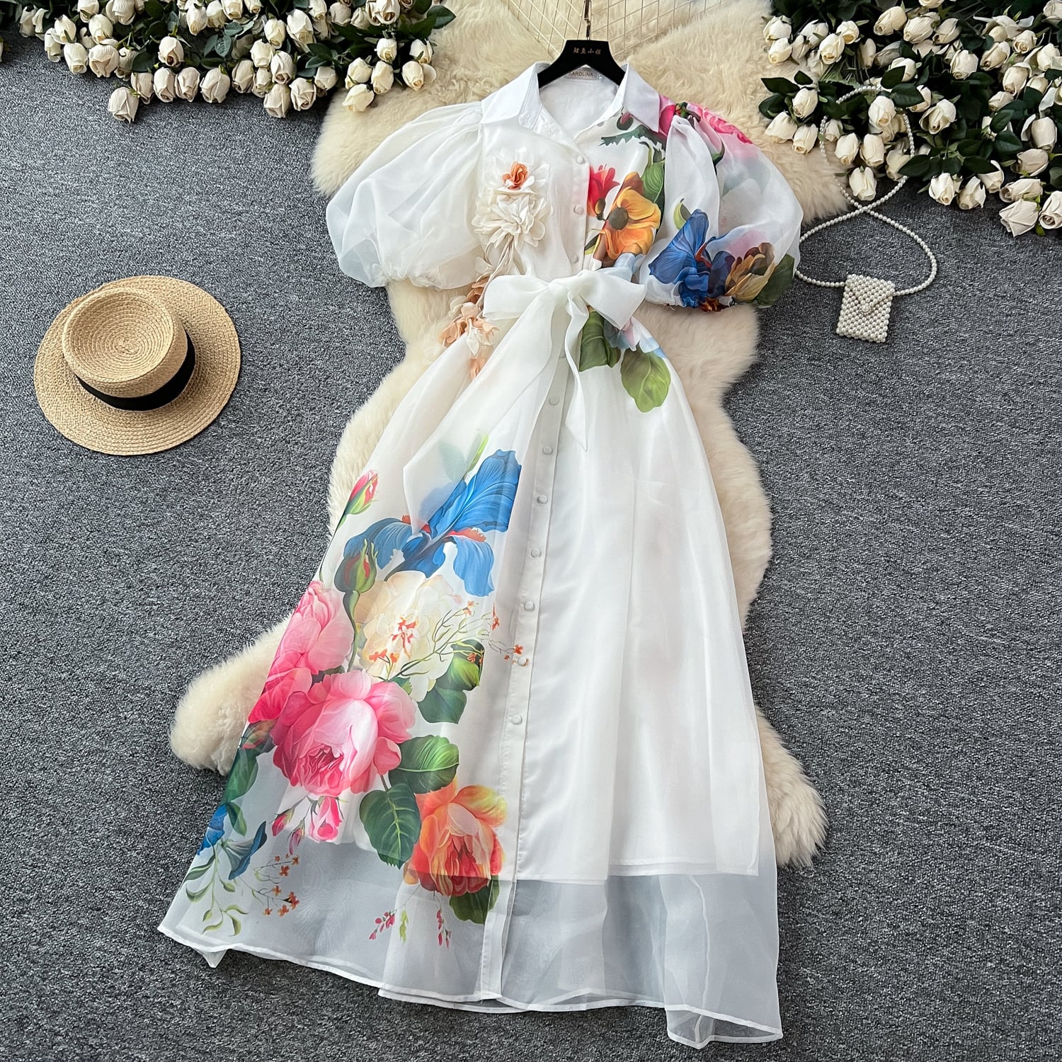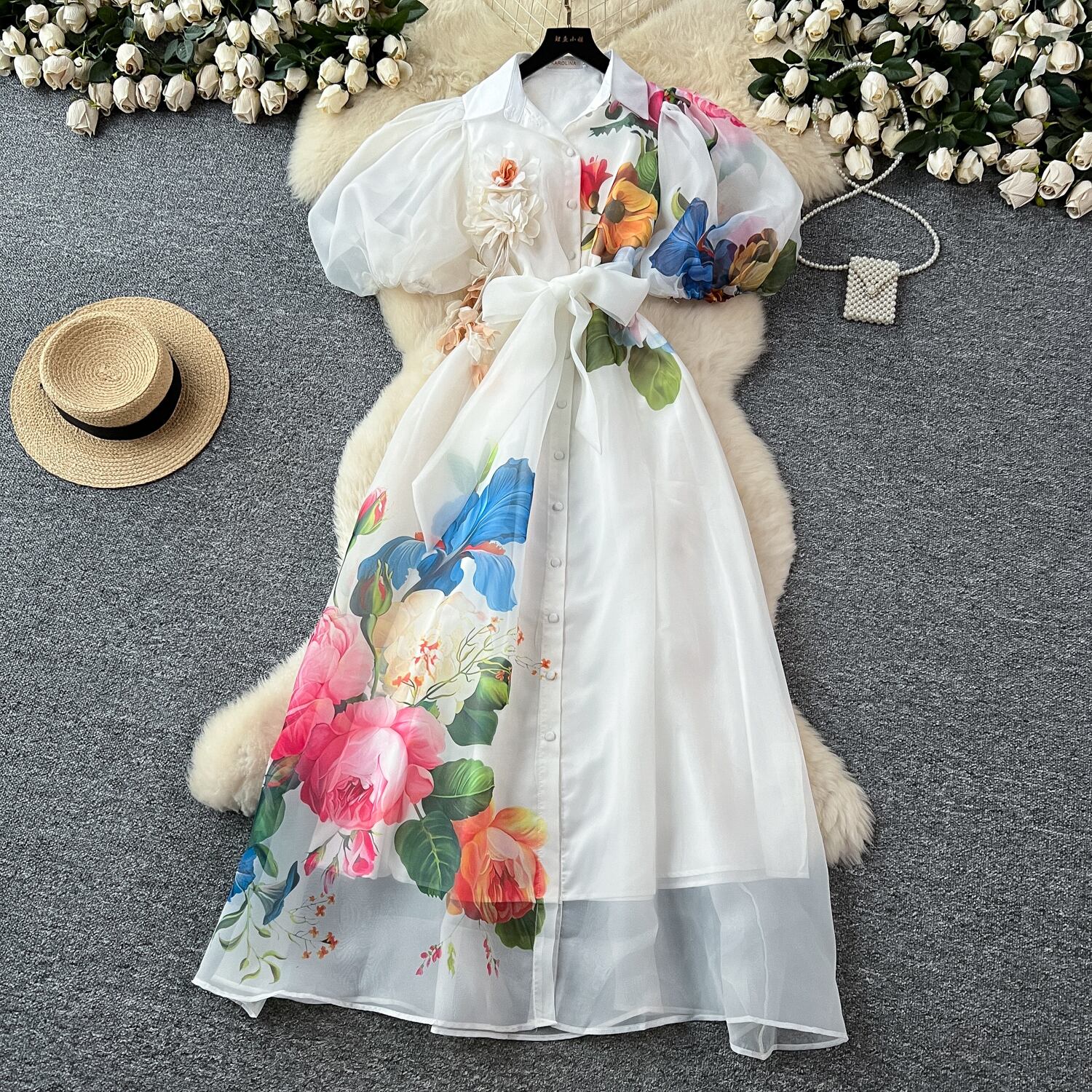 繊細なフラワープリントと透け感のある素材が軽やかに揺れ、