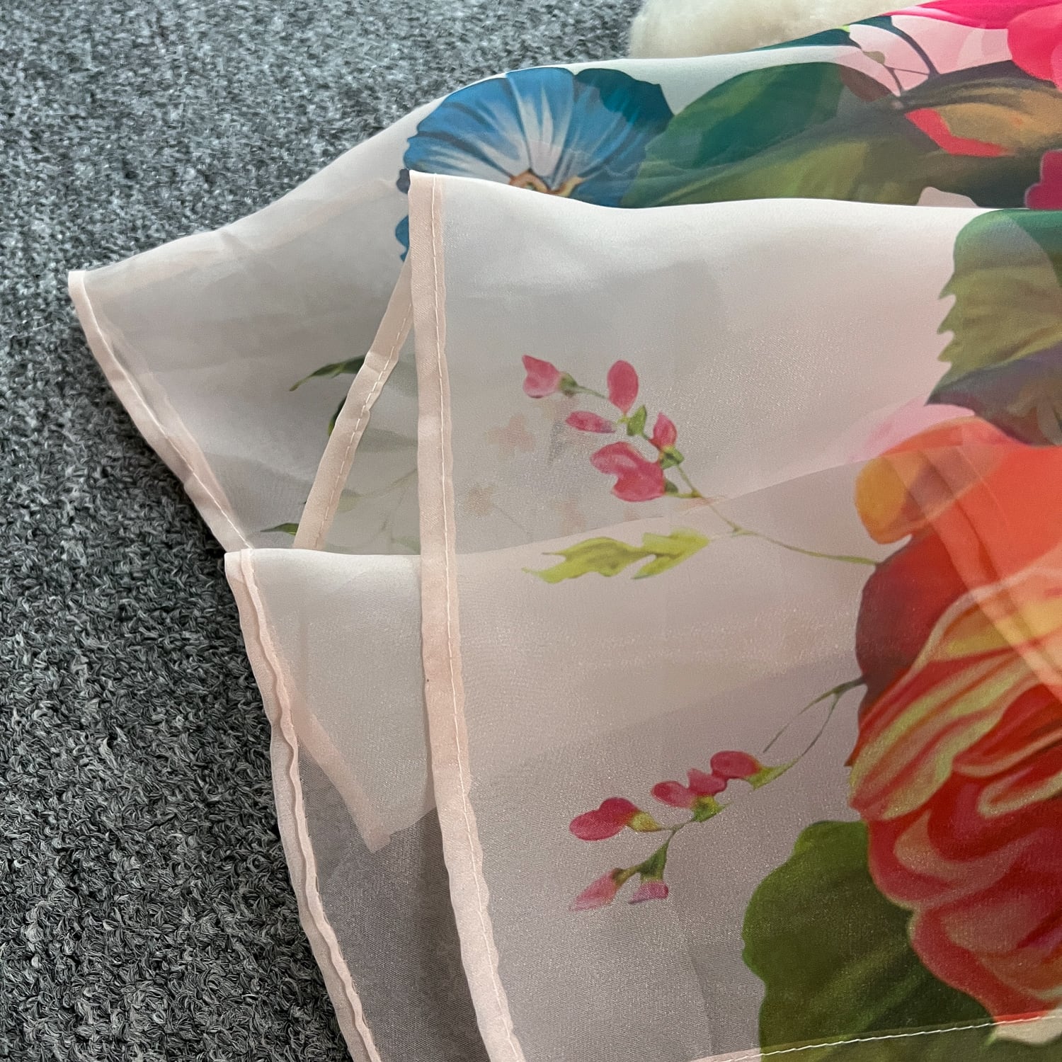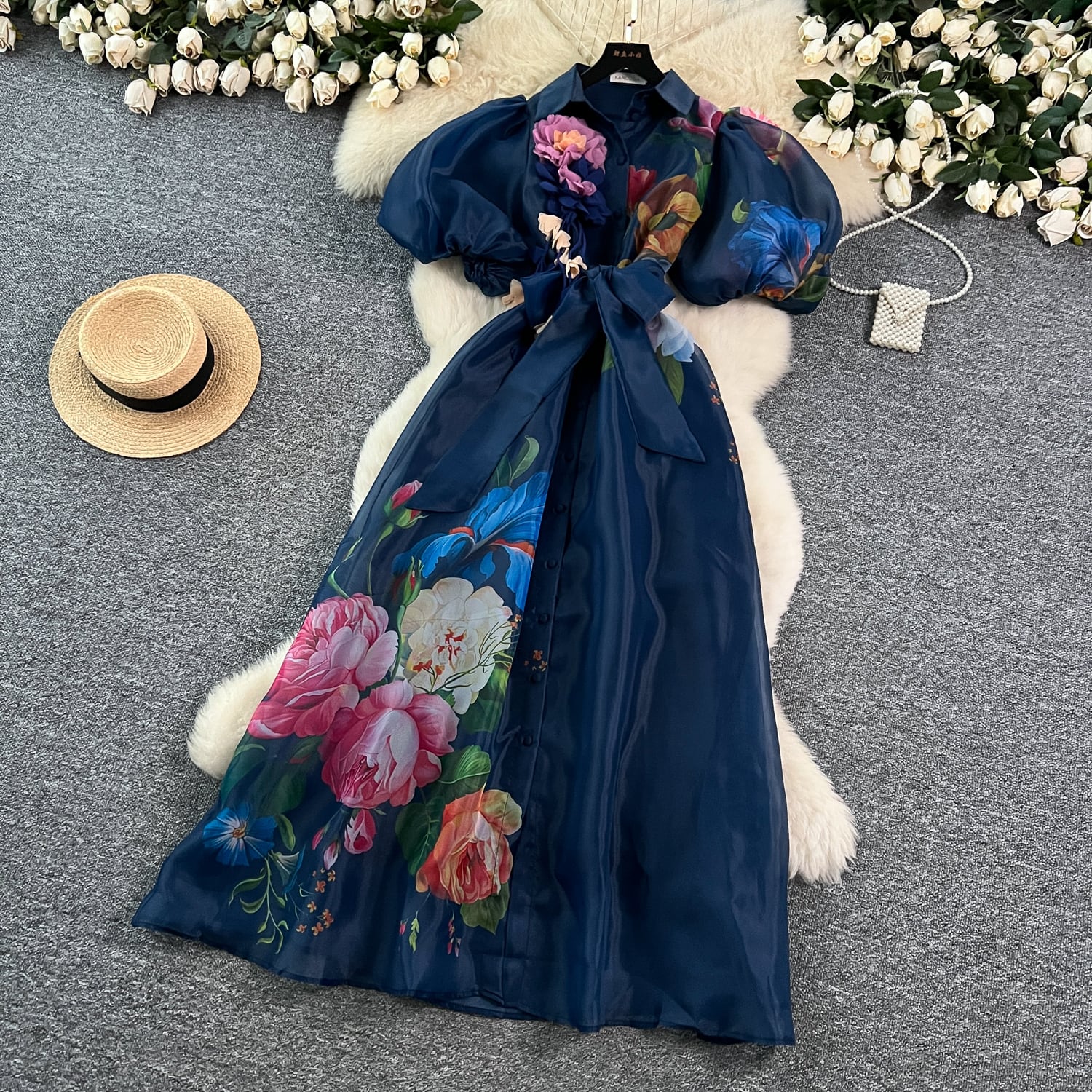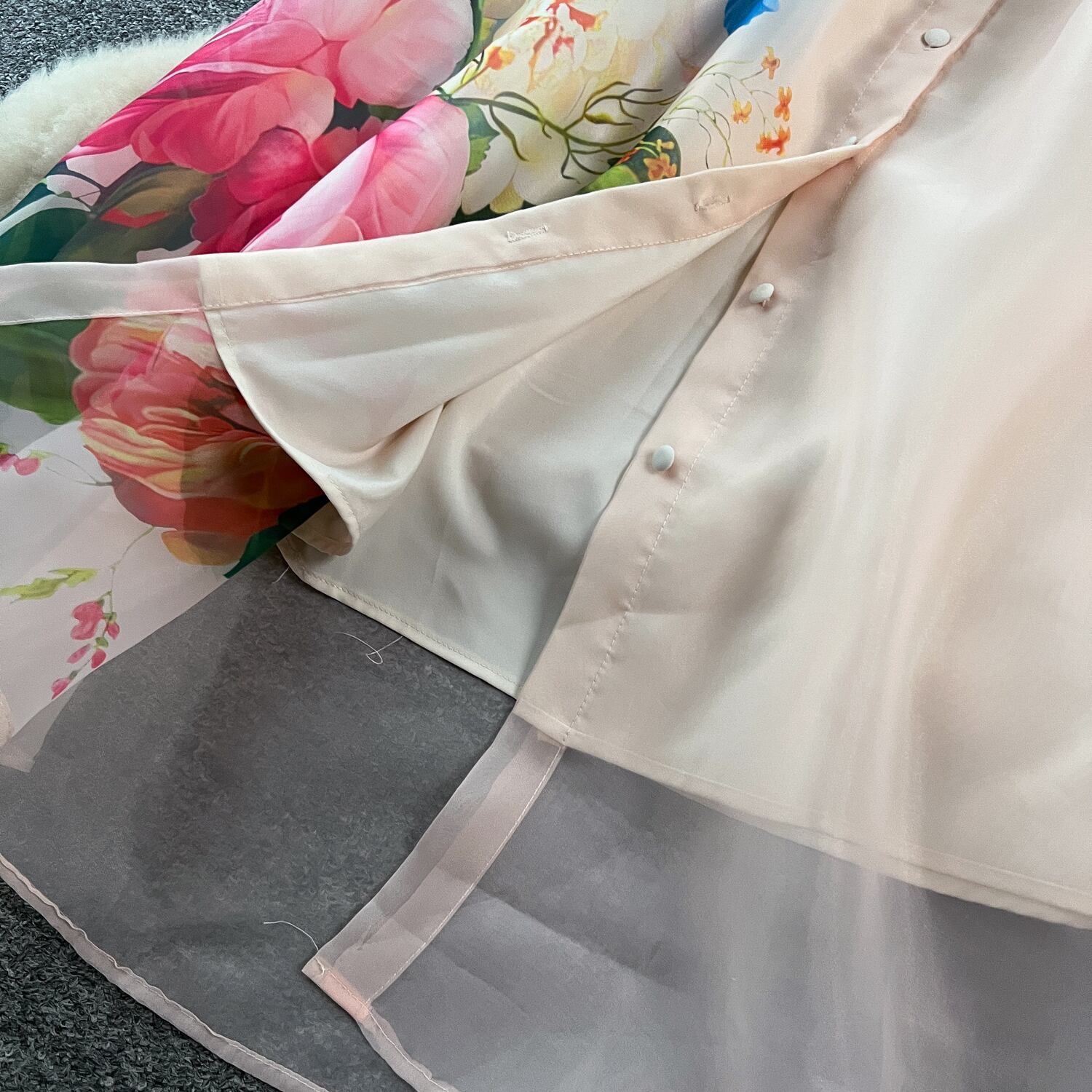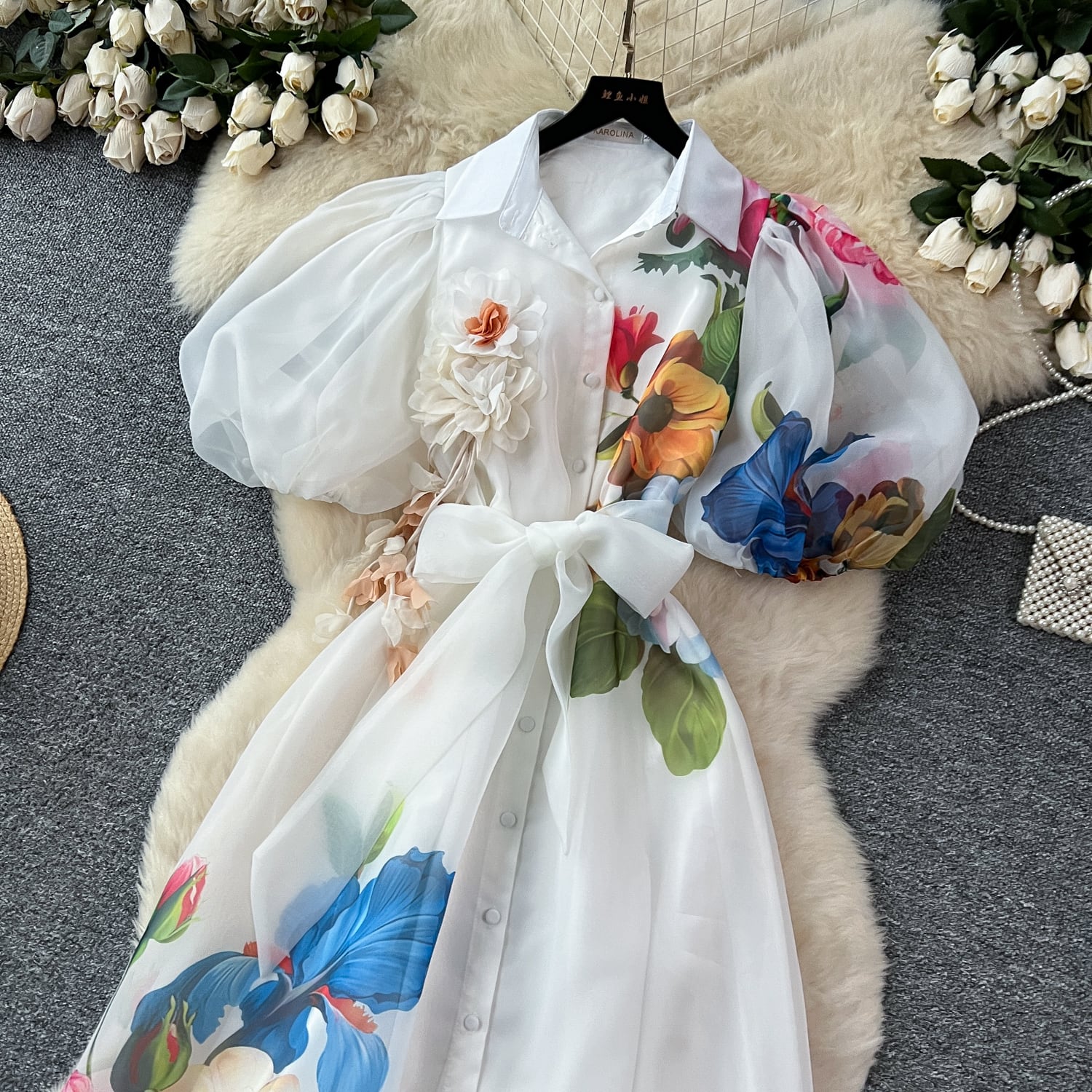繊細なフラワープリントと透け感のある素材が軽やかに揺れ、