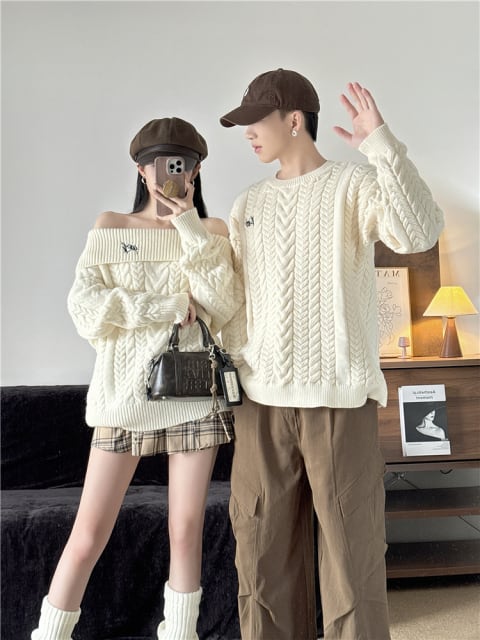 立体感のあるケーブル編みが上品で、ふたりで並んだときにまるで映画のワンシーンのような温もりを感じさせます。