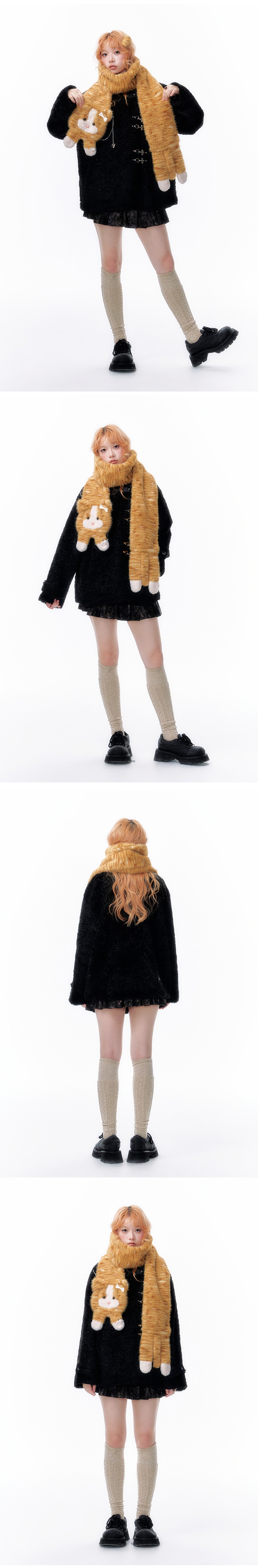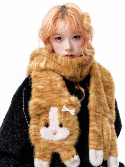 やわらかな毛並みとまんまるな瞳が愛らしい、橘猫(オレンジキャット)デザインのもこもこマフラー。