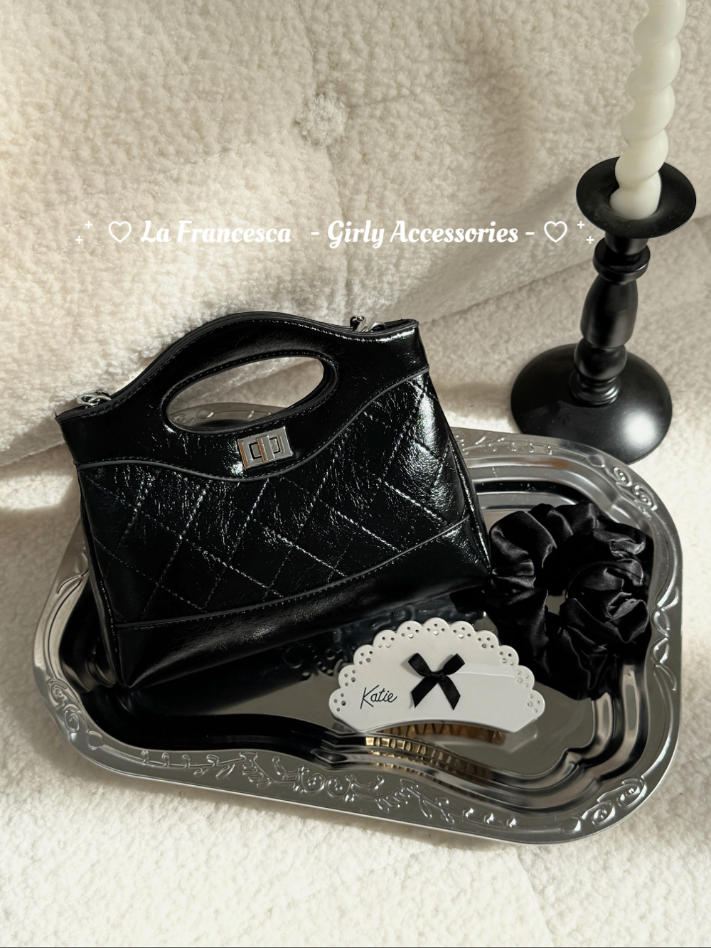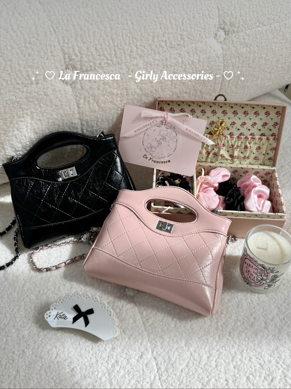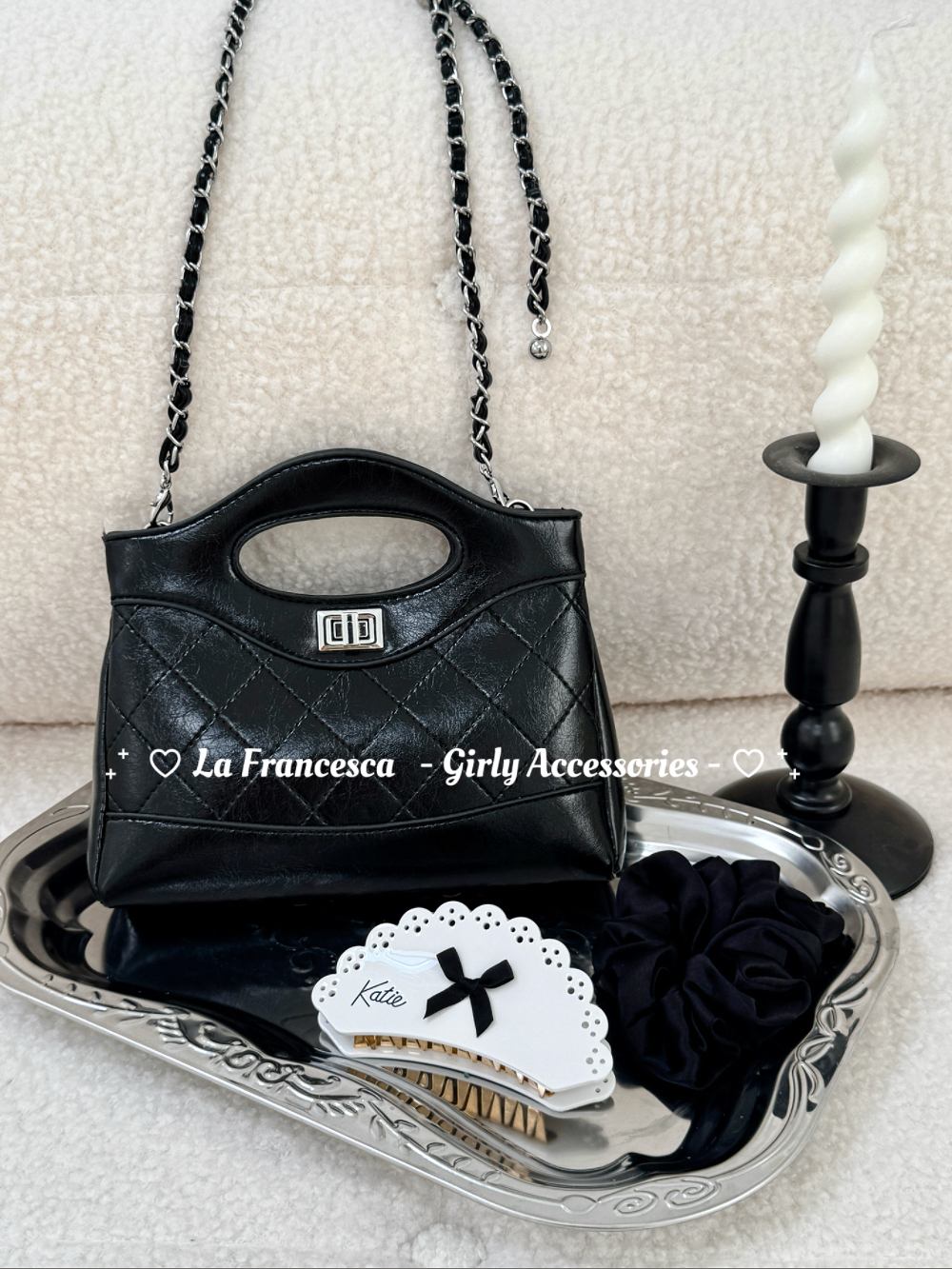 繊細なチェーンと艶めく金具がきらりと輝き、