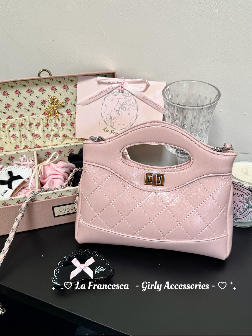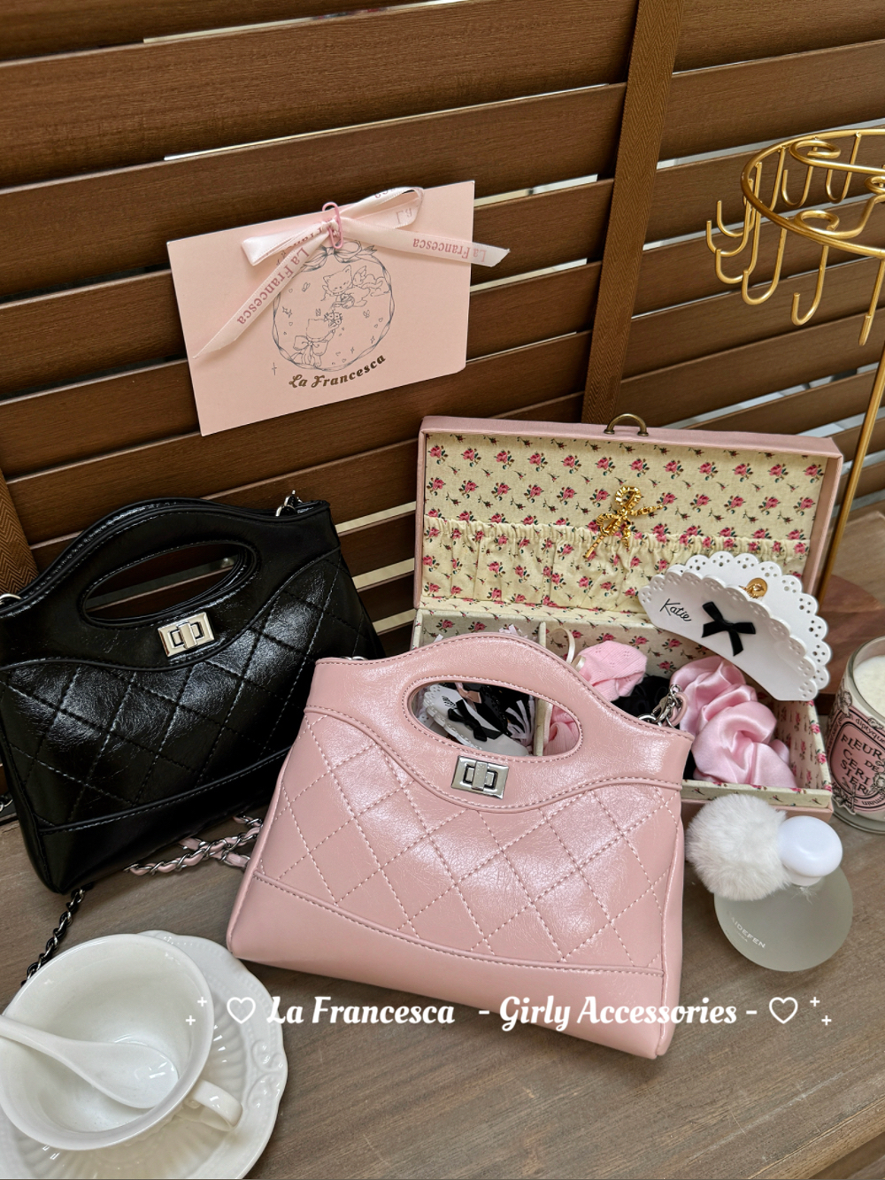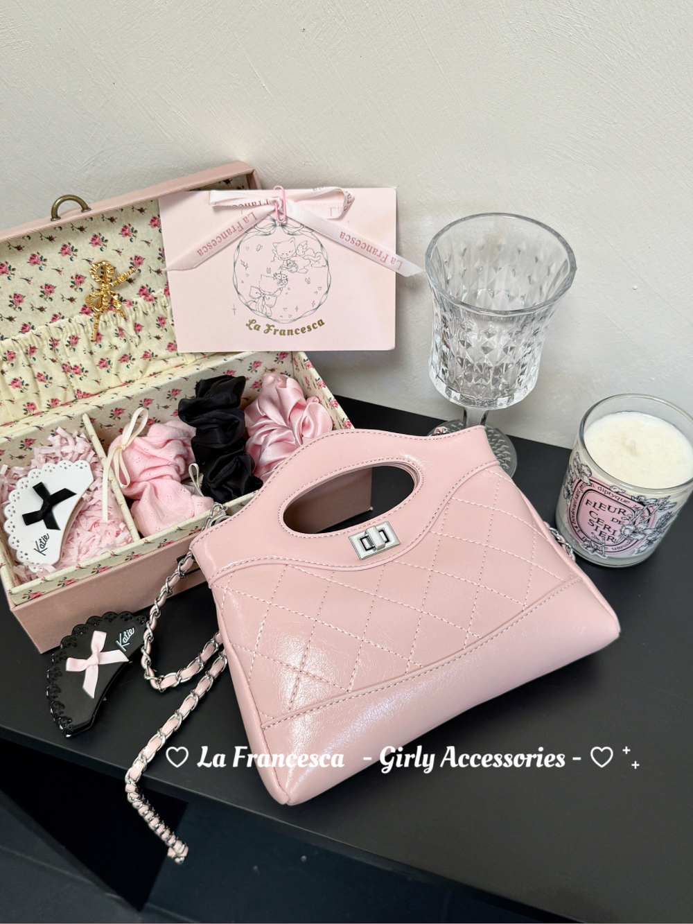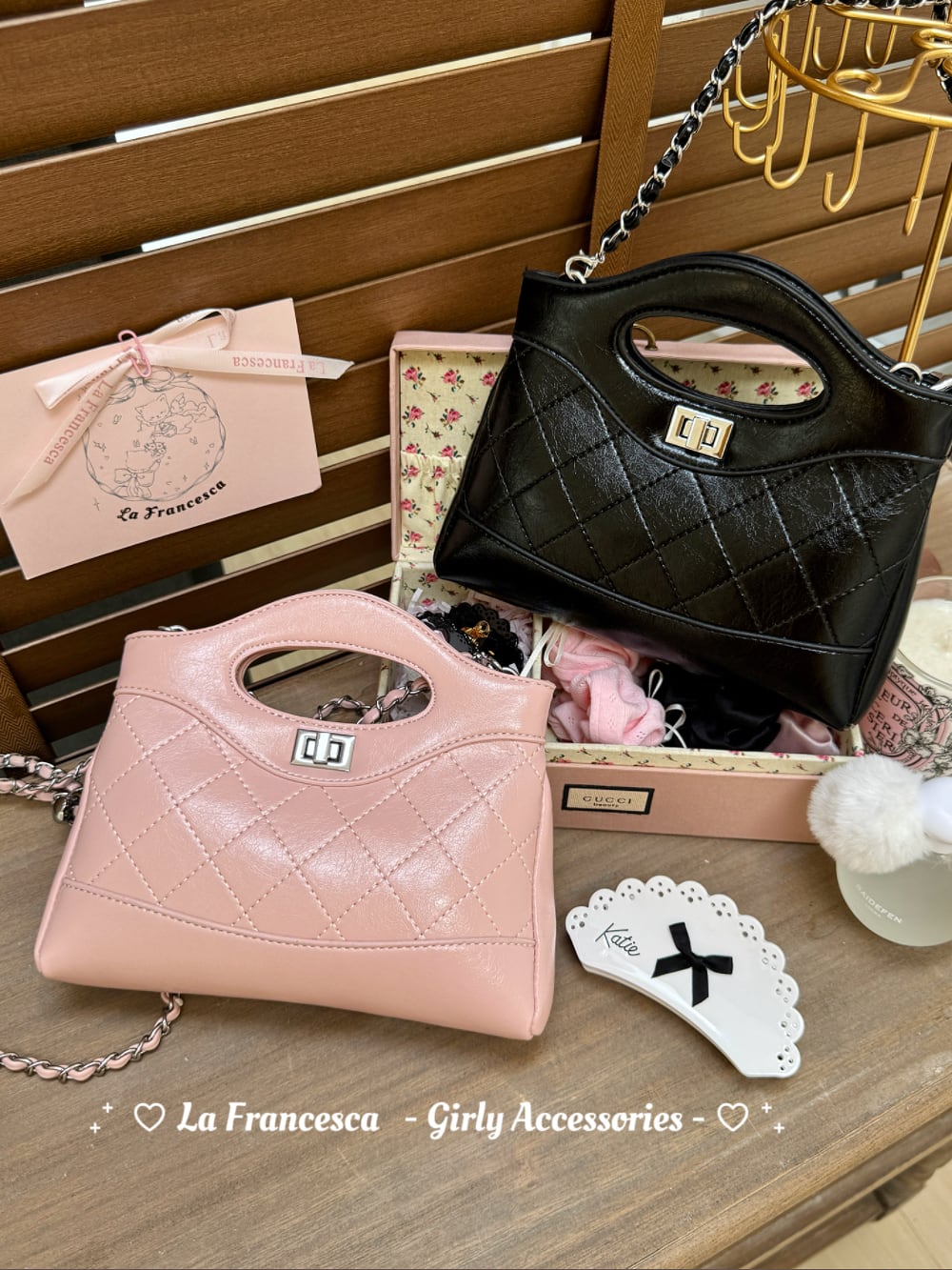 繊細なチェーンと艶めく金具がきらりと輝き、