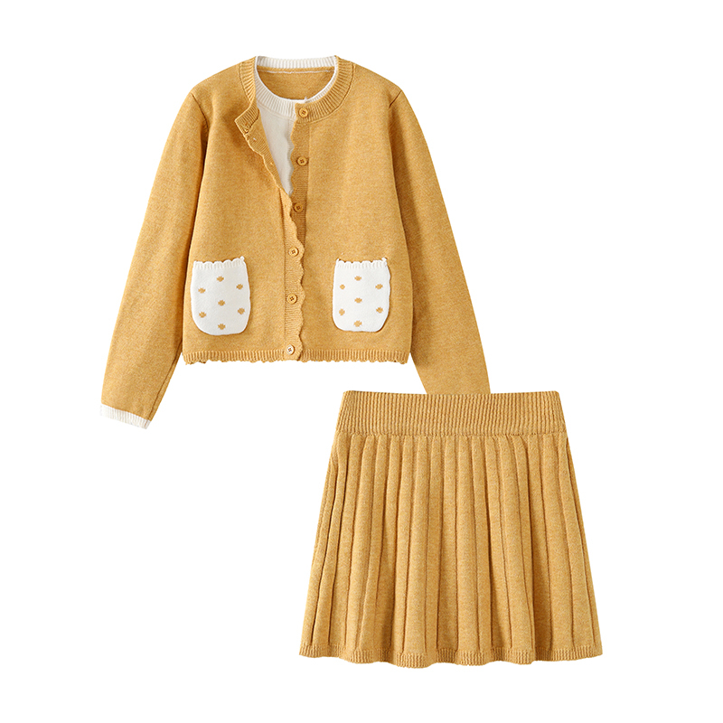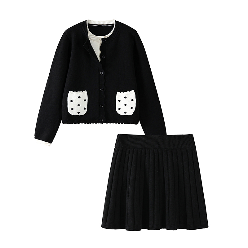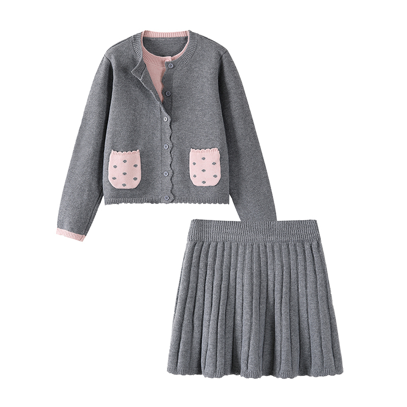 デザイン性の高いニットカーディガンとプリーツスカートの2点セット。