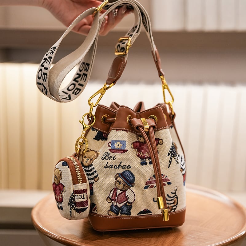 愛らしいテディたちが踊るLUVXYセレクトのバケットバッグ。