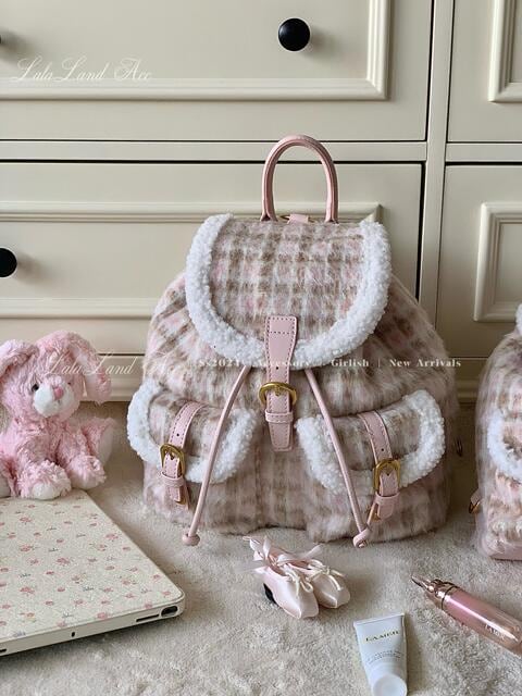 ピンクレザーのトリミングと、ふっくらとしたファーの縁取りが
