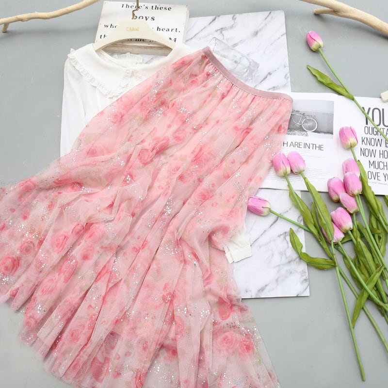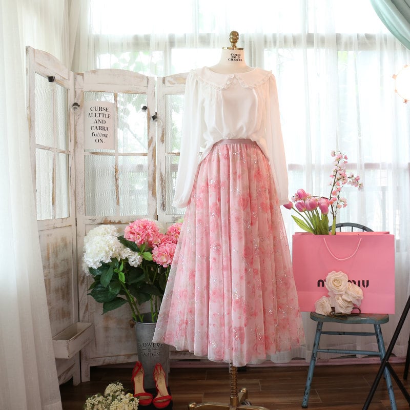 咲きこぼれる薔薇の花びらを閉じ込めたような、ロマンティックなロングスカート。