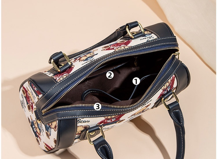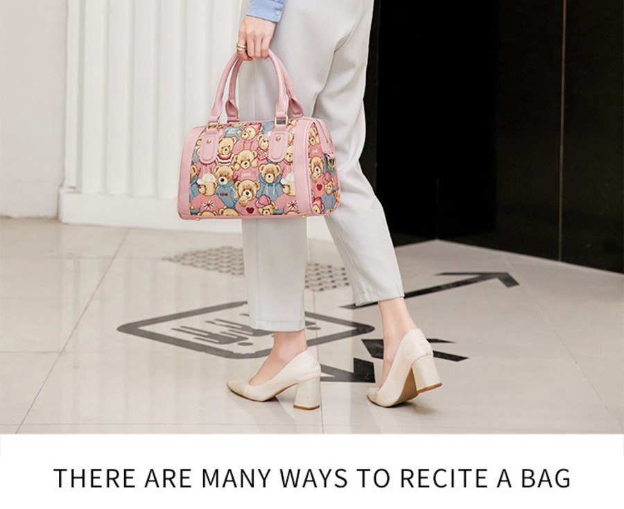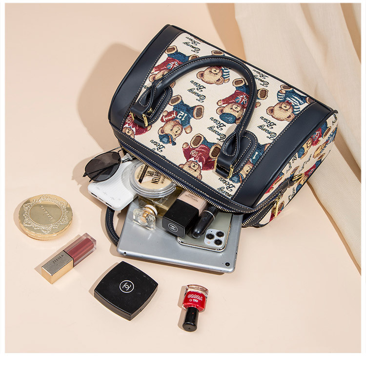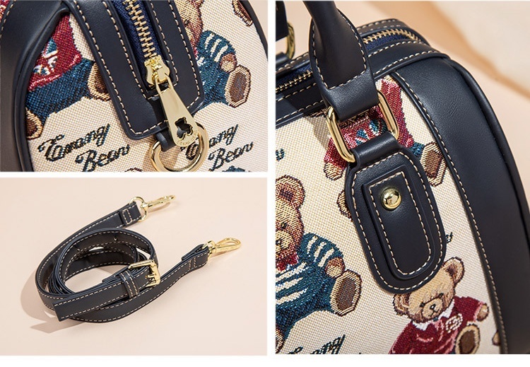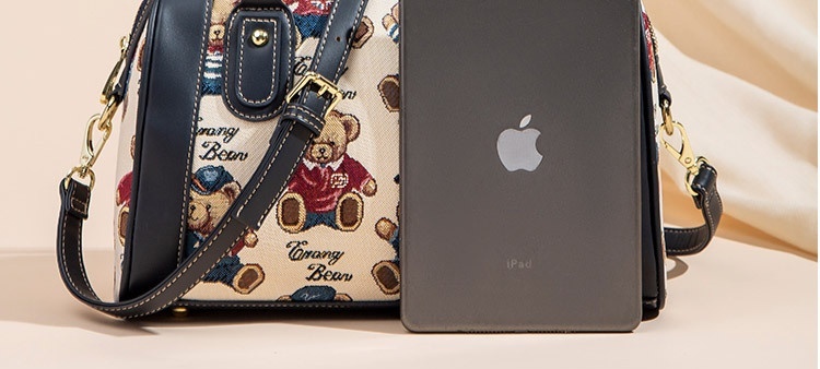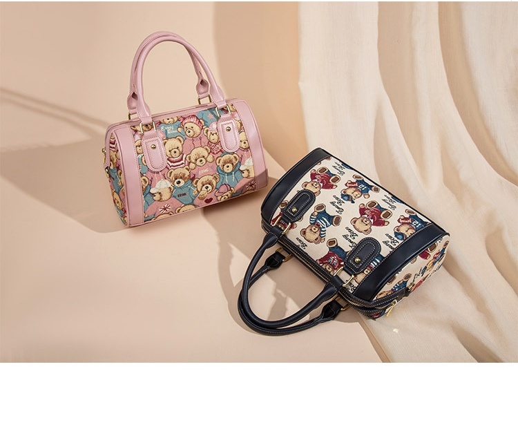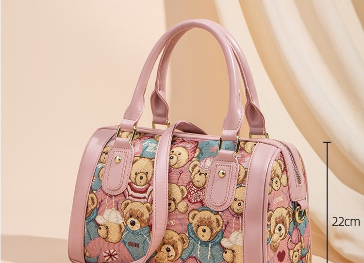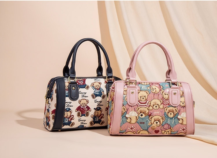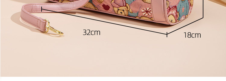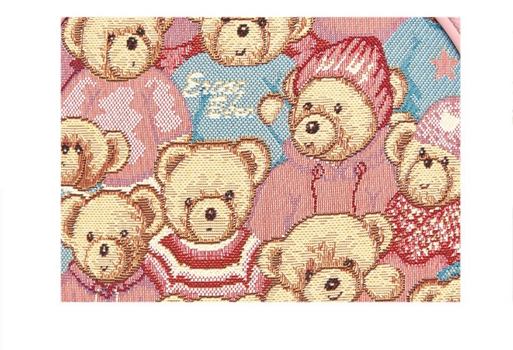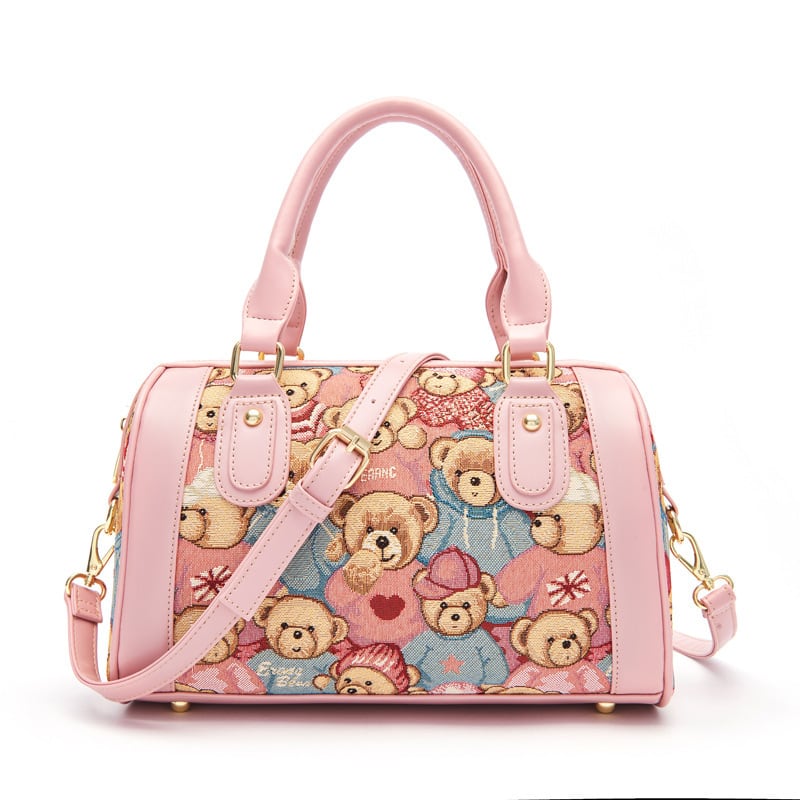 淡いピンクのレザー調素材に、ふんわり優しい色合いのベアジャカードを組み合わせたLUVXYらしいデザイン。