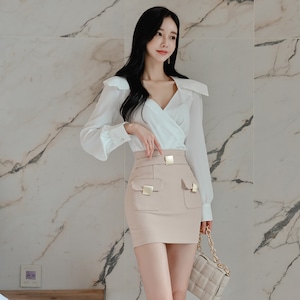ふんわり優しいピンクの色彩に包まれたシャツとタイトスカートのセットアップ。