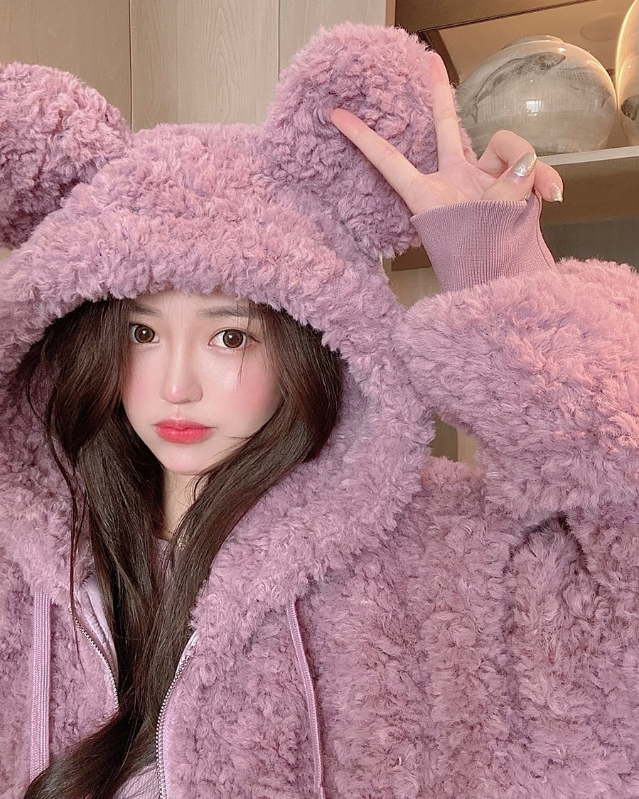 くま耳フードが愛らしい、ふわふわの手触りが魅力のもこもこパーカー。